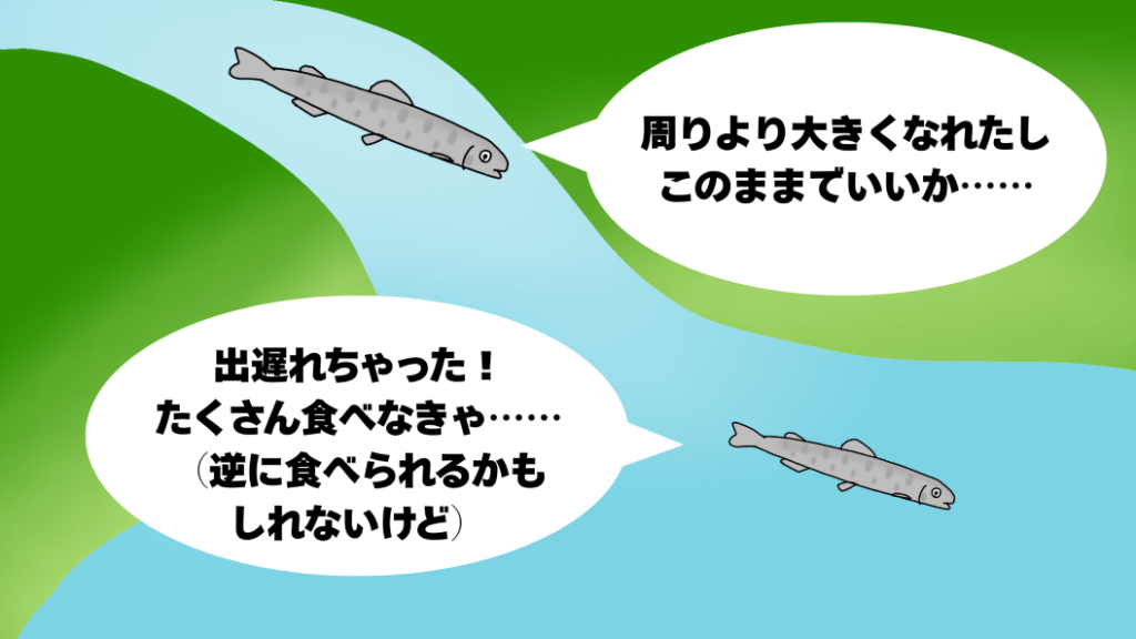 実は、サケの仲間の中には海に出ず、生まれた川で成長する「地元進学」タイプもいます。稚魚の時点で周りよりも体が大きい個体は「地元進学」を選ぶことが多いようで、危険な旅に出ずとも十分に成長できるのでしょう。回遊型はハイリスク・ハイリターン、逆に残留型はローリスク・ローリターンの生き方ということです。