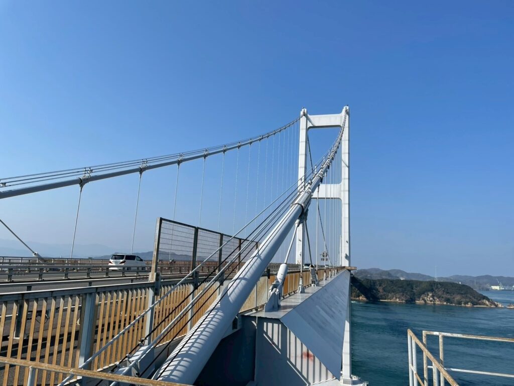 ただ、そのぶん橋の上からの景色は圧巻でした。来島海峡はしばしば日本三大潮流のひとつに数えられるだけあって、眼下の海には強い流れが走っているのがはっきり分かりました。対岸近くで海面が白く泡立っているのを見ると、「潮流が速い」と言われるだけでは済まない迫力がありました。
