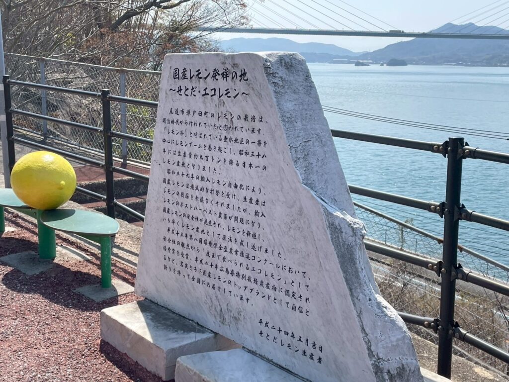 多々良大橋の上で県境を越え、広島県に入ります。生口島に渡ると、今度はレモンの気配が濃くなってきました。なんでも生口島は国産レモン発祥の地らしく、橋を渡ってすぐにモニュメントが現れるほか、島の日当たりのよい斜面にはレモンの木が目立っていました。