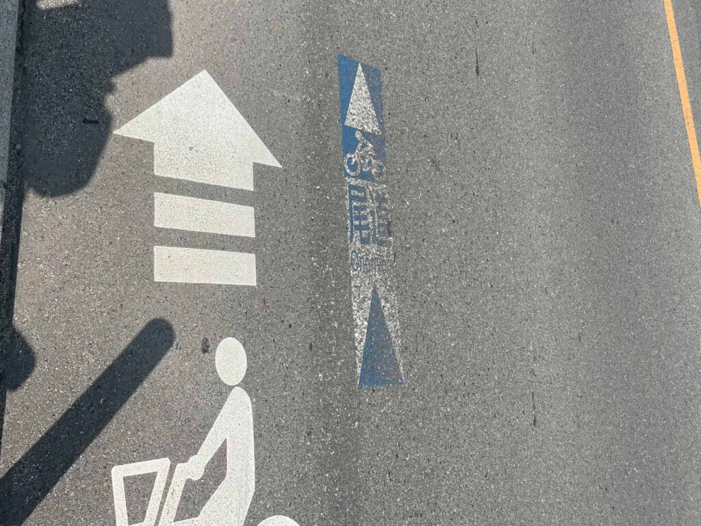 走り始める前には道に迷わないかと心配だったのですが、路面にはサイクリングコースを示す青線と「尾道までの距離」が書いてありました。親切設計です。親切なのですが、スタート直後に「尾道まで70km」と見えたときは、さすがに絶望しました。