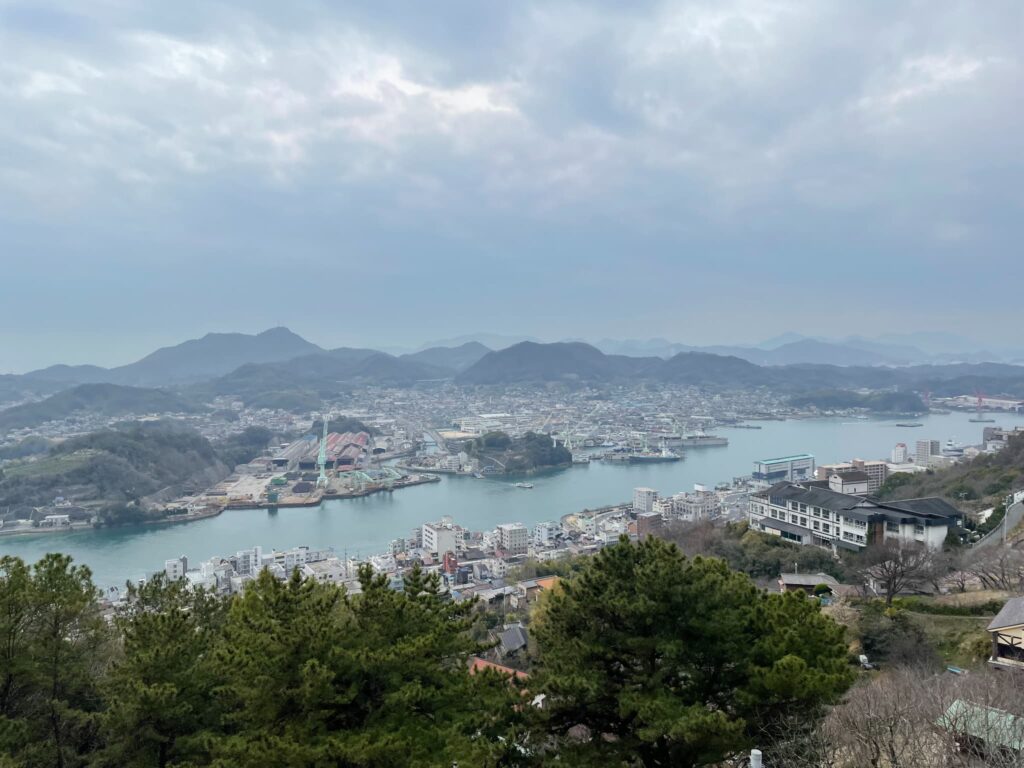 翌日、尾道の千光寺公園に行ってみました。山から見下ろすと、すぐそこに向島があり、そのさらに先には自分が渡ってきた島々が続いています。遥かかなたからここまで来たんだなぁ、と感慨深い気持ちになりました。