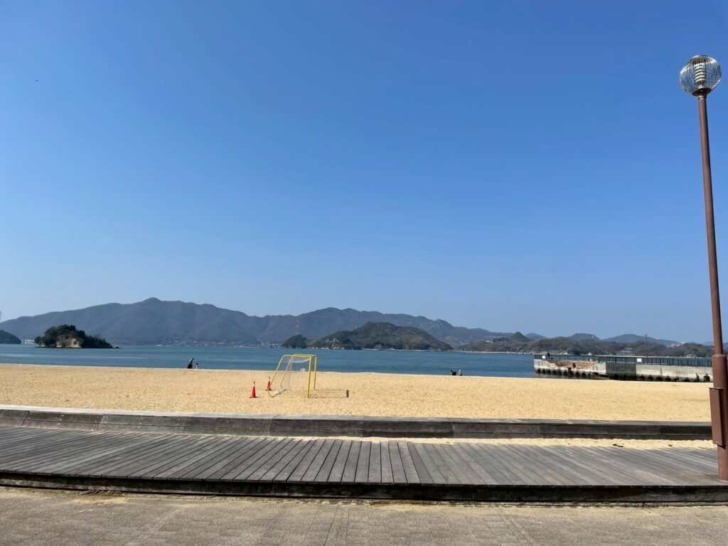 終盤になると、海の表情も少しずつ変わってきます。南側で見た荒々しい潮流とは異なり、因島北部では海が穏やかに見え、岸辺には砂浜も目立つようになりました。