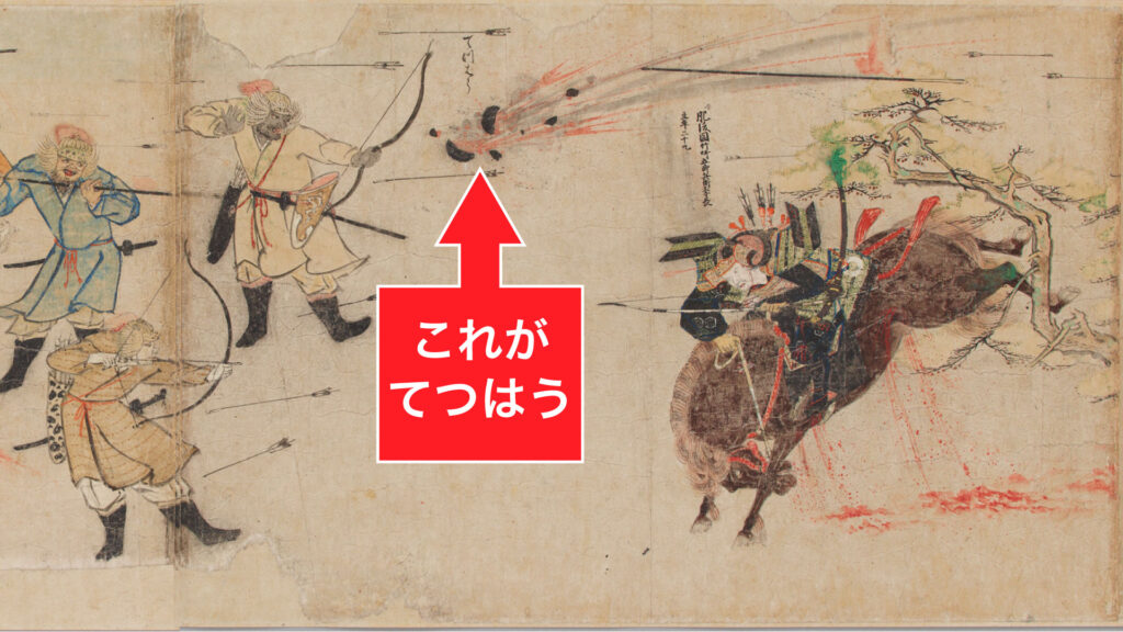 元軍と戦っている竹崎季長の近くには、「てつはう」と呼ばれる爆弾がさく裂しているのが分かります。鷹島海底遺跡ではこの「てつはう」と見られるものが見つかったんです。