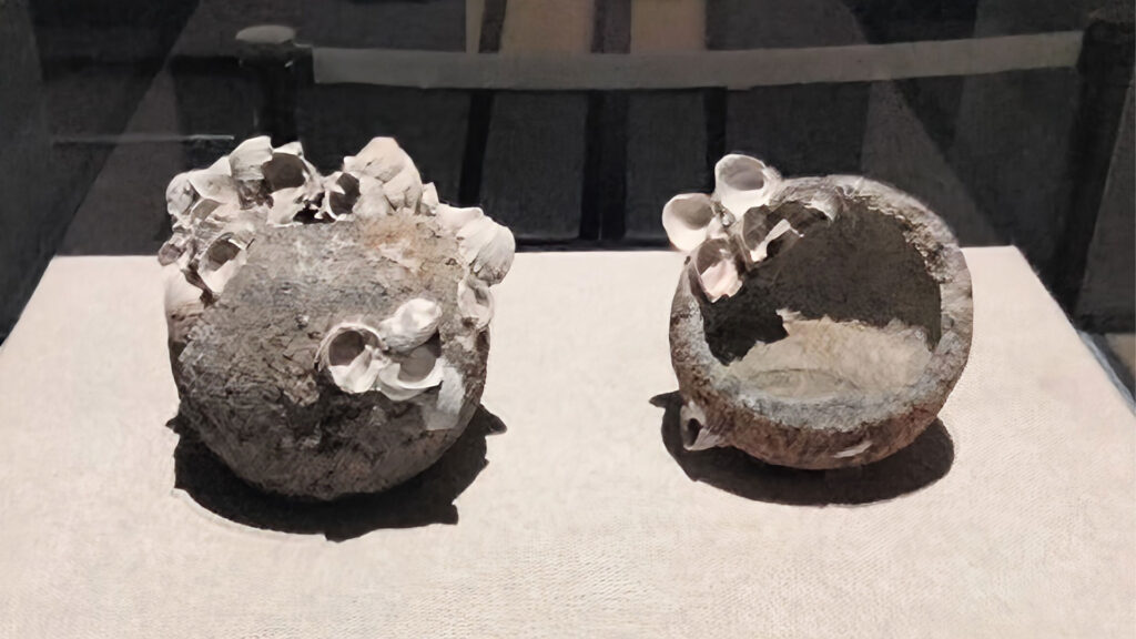 『蒙古襲来絵詞』以外にはほとんど史料での裏付けがなかった「てつはう」が、鷹島海底遺跡の調査によって存在していたことが確認されました。さらに見つかったてつはうの一部をCTスキャンで撮影した結果、内部に小さな鉄片や陶器片のようなものが詰められていることがわかりました。火薬で爆発させると、かなり殺傷力の高い武器であったと考えられます。