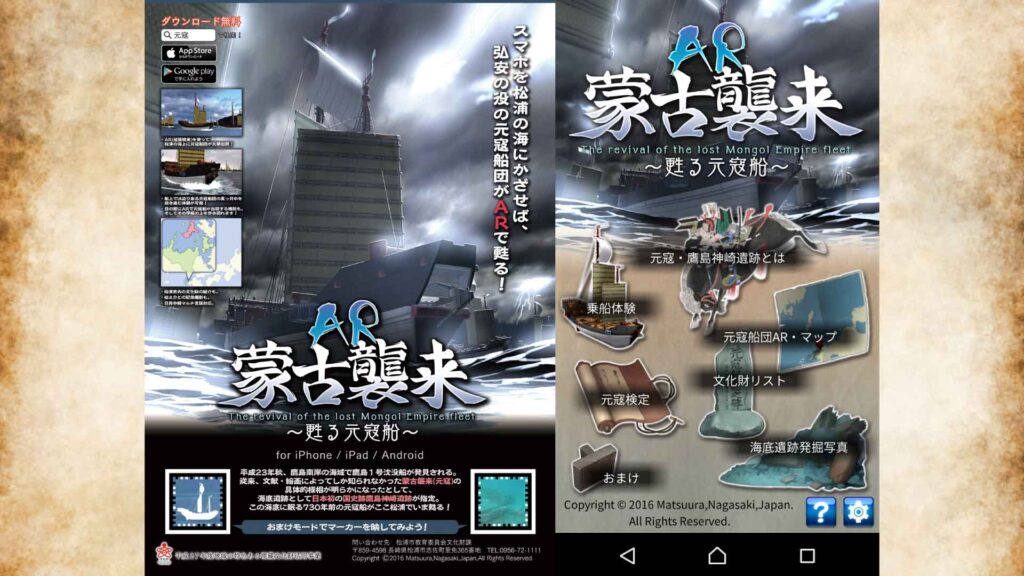 これらの研究結果を受けて、ARで元寇の様子などを体験できるアプリがリリースされています。映像やクイズなどで元寇と鷹島海底遺跡を知ることができるだけでなく、一人称視点で鷹島海底遺跡を探索したり、ARを使って元寇船に乗船してみたり、といったコンテンツを楽しむことができます。この記事を読んで気になった方は試してみてください!