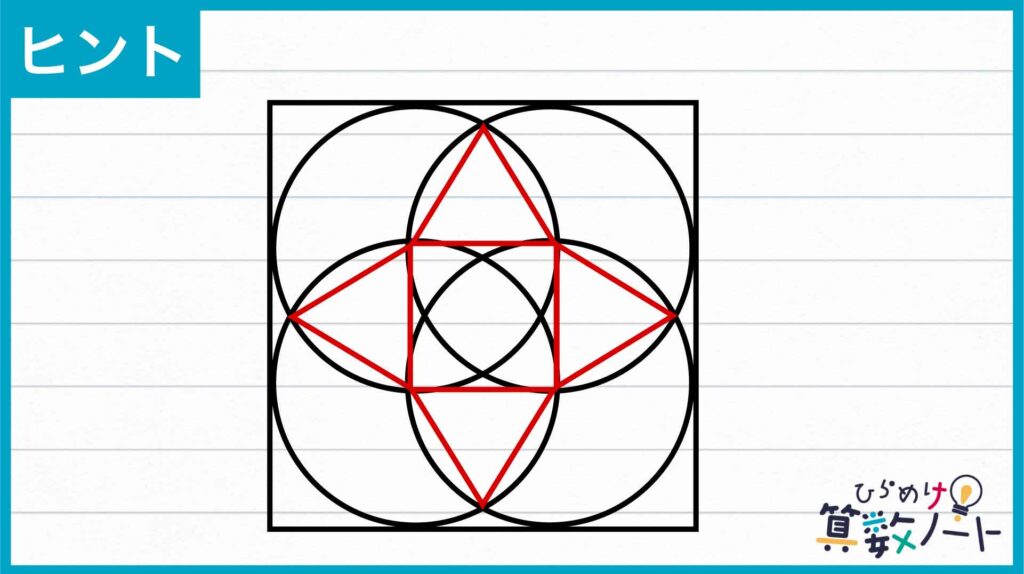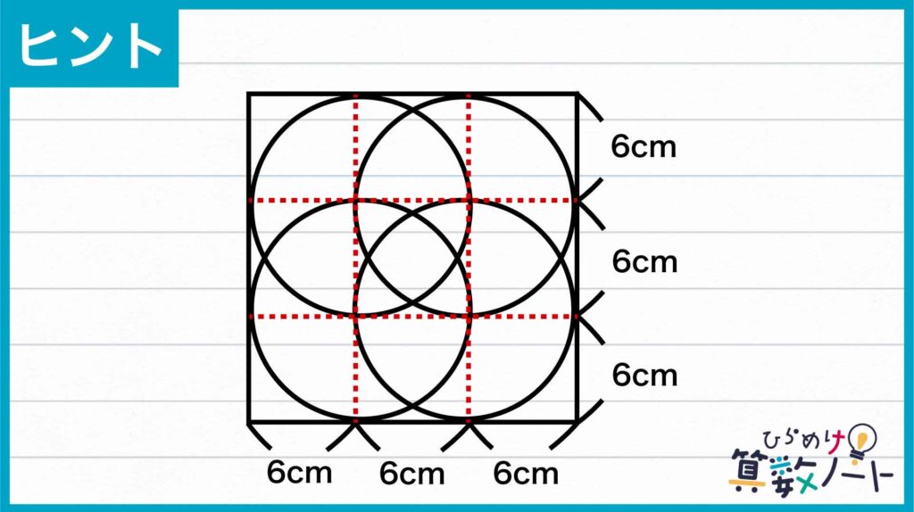 ヒント 1辺が18cmの正方形に半径が6cmの円が並んでいることから、重なった円の円周は縦・横隣の円の中心を通っていることがわかります。 そこで下の図のように、円の交点どうしを線分で結んでみます。 交点を結んでできた三角形と四角形にはどんな特徴がありますか? 3ページ目:【答え&解説】ここまで来ればあと少し!答えと解答はこちらへ