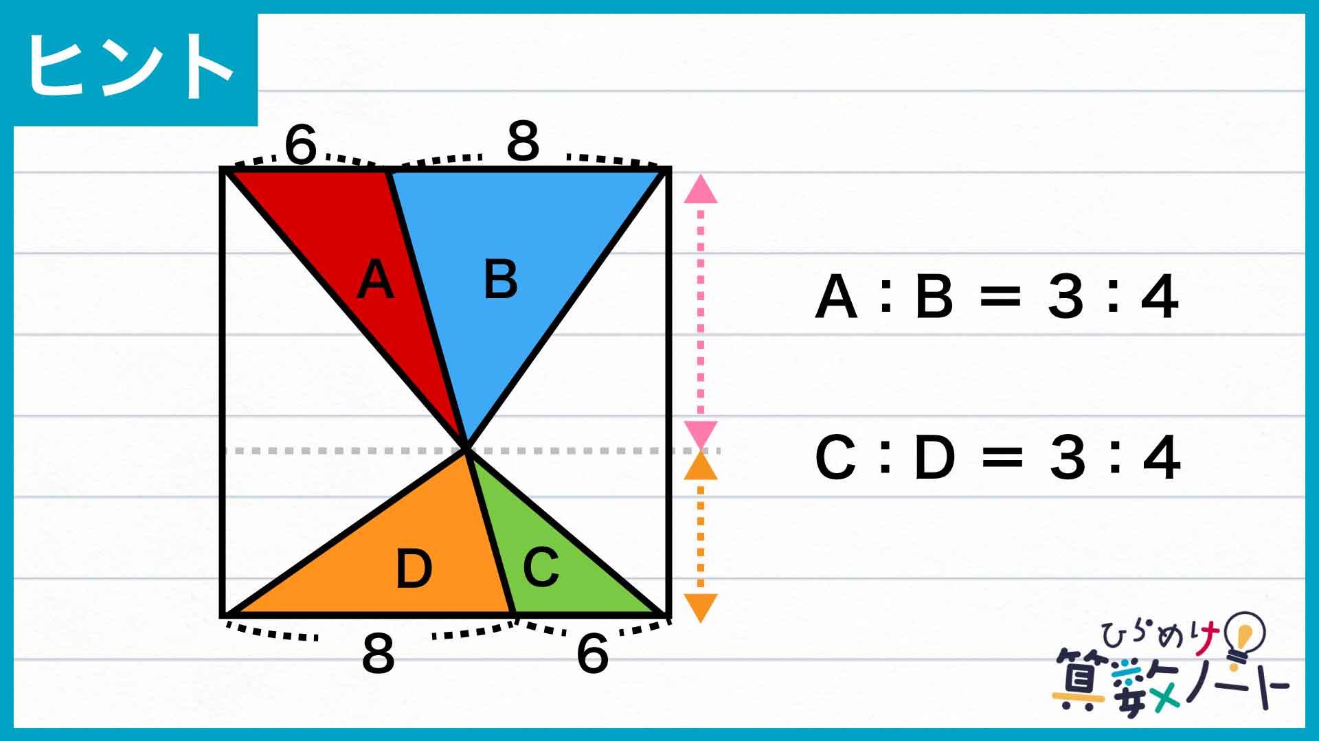 下の図では、三角形AとB、CとDの高さがそれぞれ等しいため、面積の比はともに6:8=3:4であるとわかります。