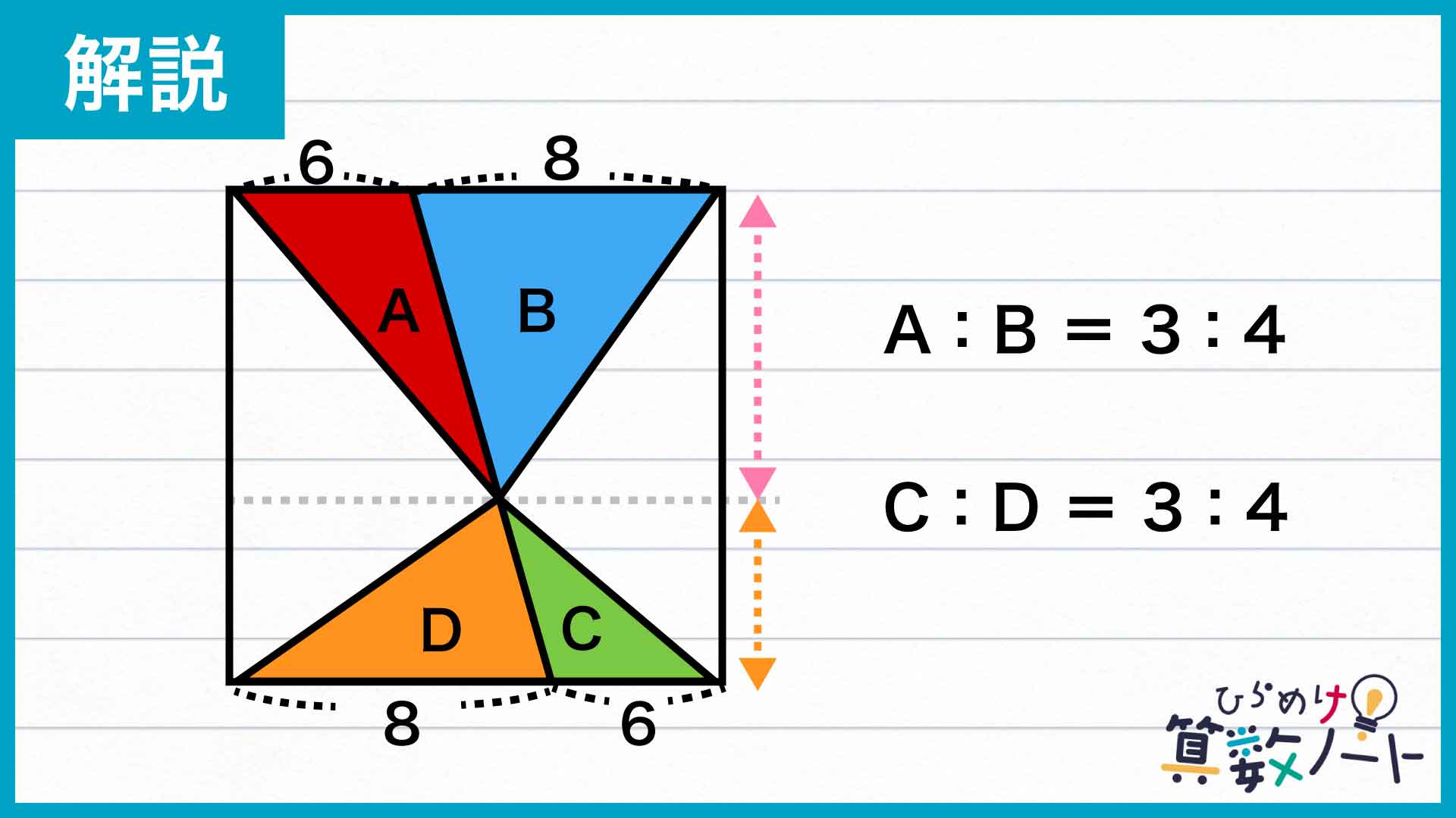 まずポイントになるのは、「高さの等しい三角形の面積比は底辺の長さの比に等しくなる」ということです。このことから、高さが共通している三角形AとB、CとDについてそれぞれ面積比がわかります。底辺の長さから、2組の三角形の面積比についてA:B=C:D=6:8=3:4が成り立ちます。