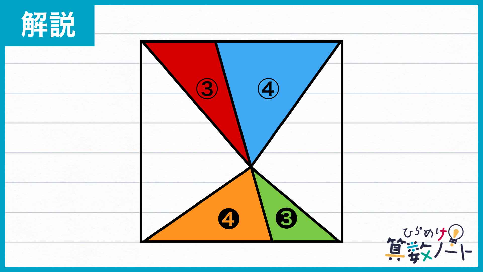 そこで、4つの三角形の面積をそれぞれA=③、B=④、C=❸、D=❹と表してみます。③と❸では実際の面積が異なることに注意してください。