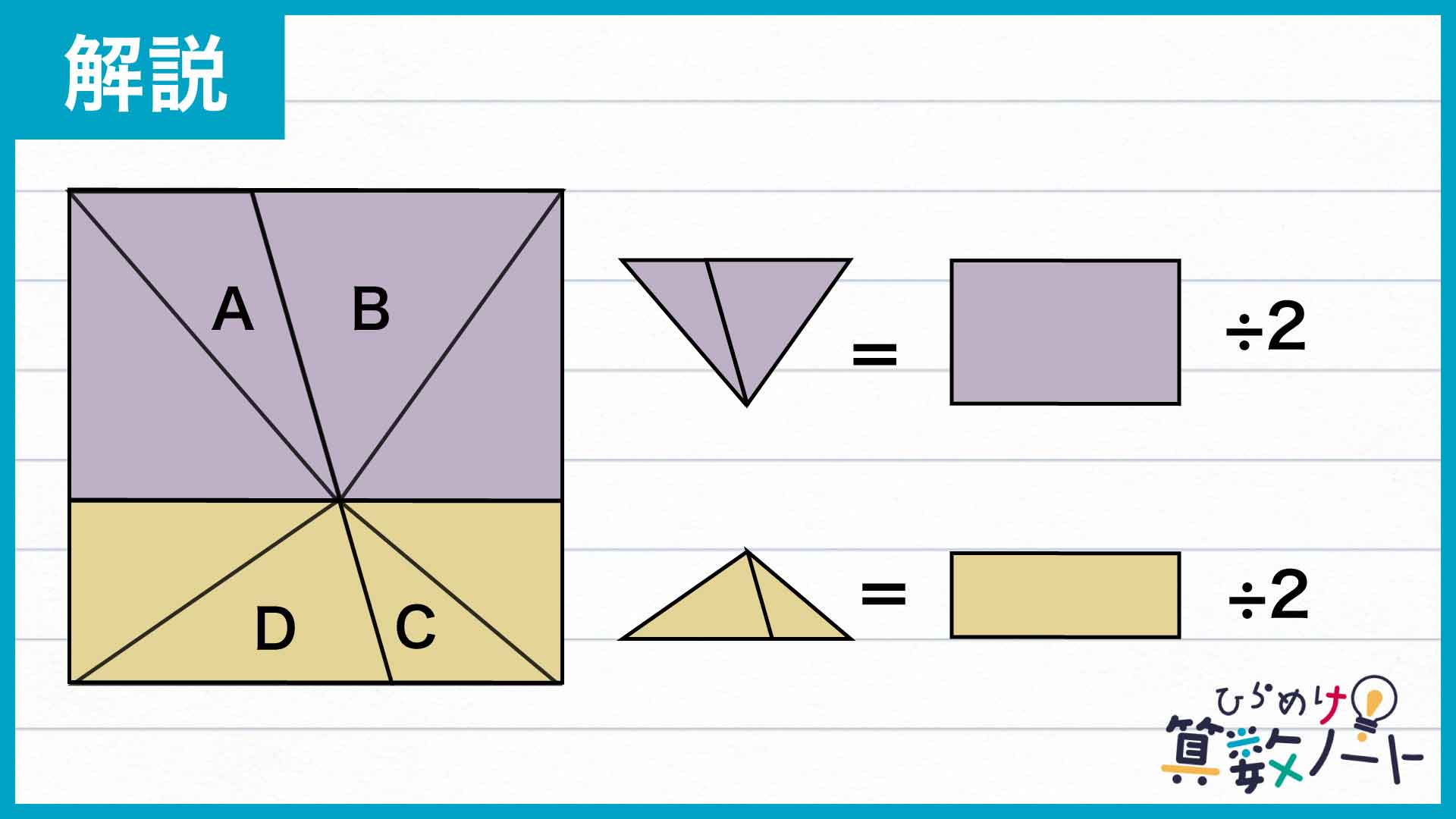 さらに、正方形を上下2つの長方形に分けてみるとAとBの面積の合計、CとDの面積の合計がそれぞれ紫色と黄色で示した長方形の面積の半分にあたります。