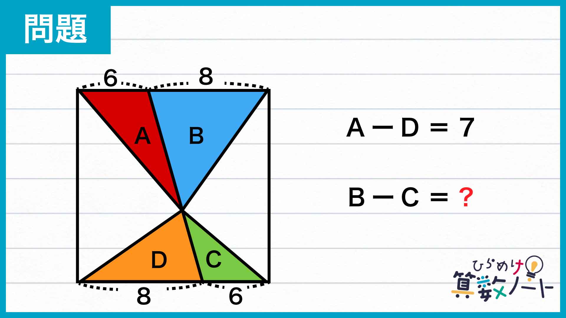 問題文に「Aの面積がDの面積より7大きい」とあるので、A-D=③-❹=7が成り立ちます。
