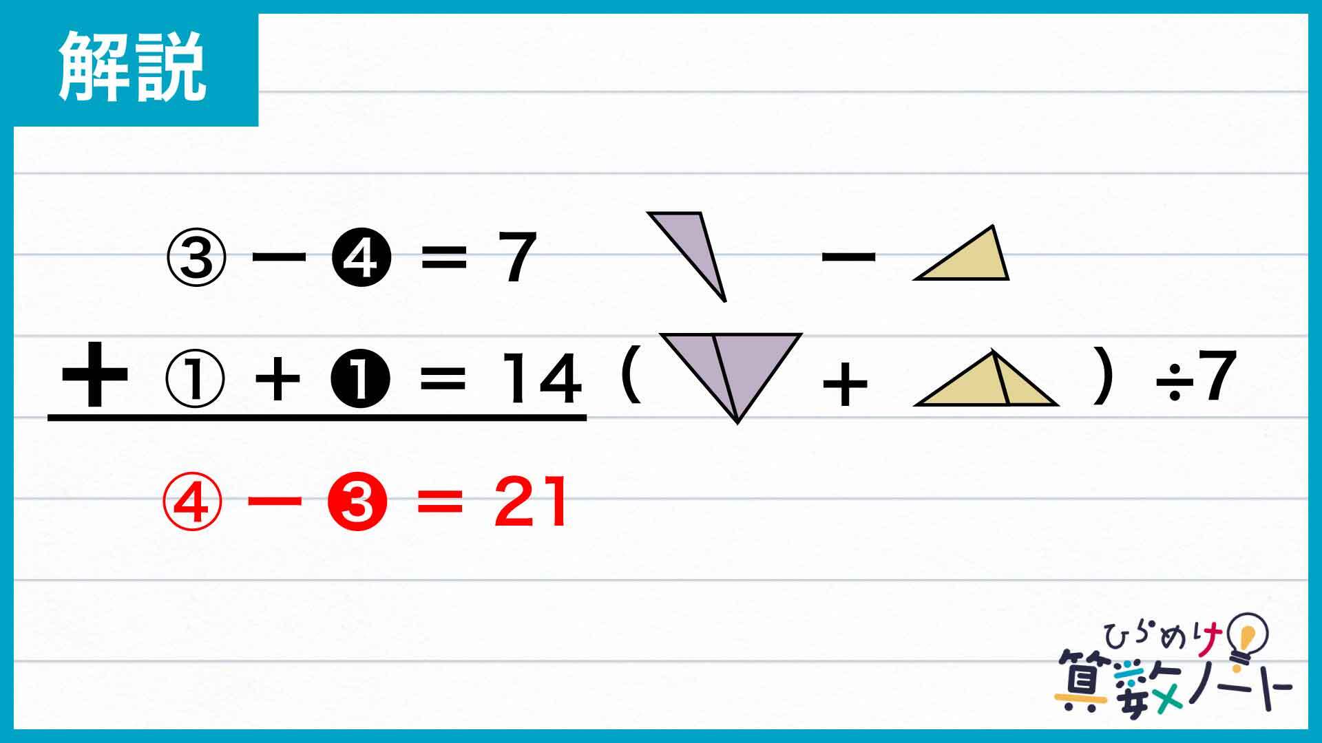 これまでの過程で、③-❹=7、①+❶=14という2つの式を導くことができました。ここから④-❸の形を作るには、2つの式の左辺をそのまま足せばいいのです。