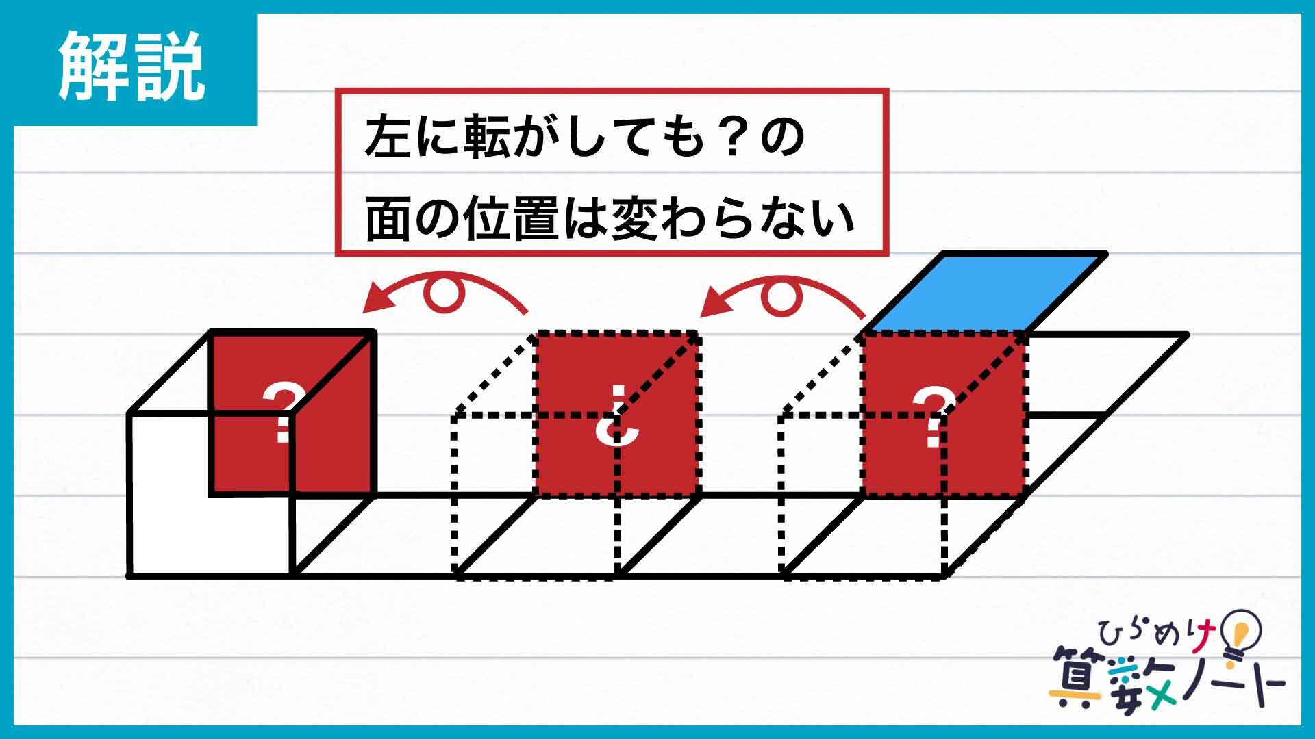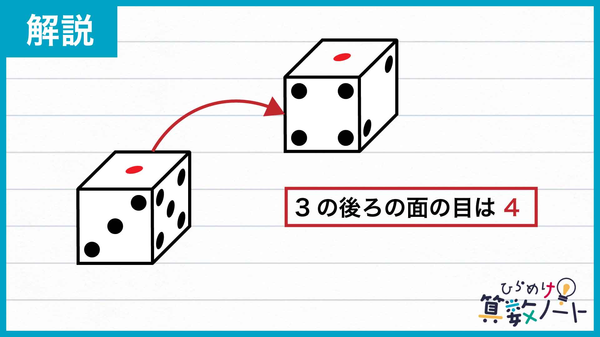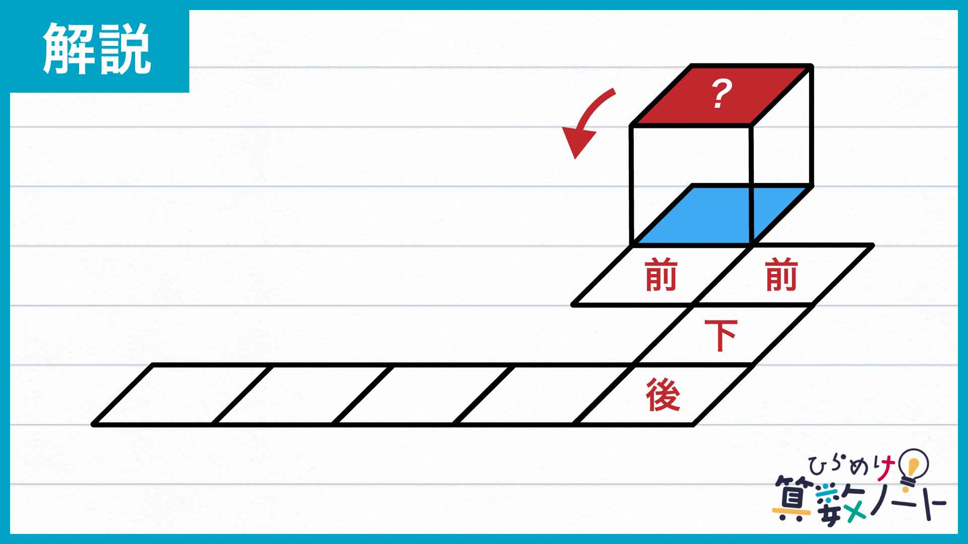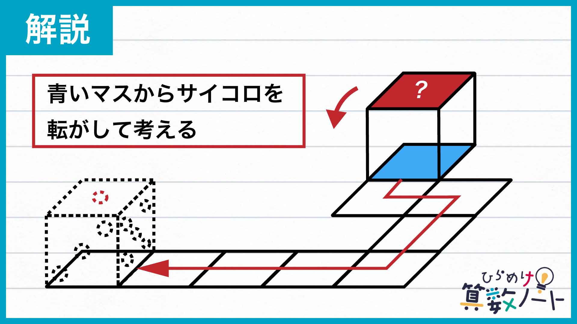 したがって、青いマスで上を向いている面は、スタート地点では後ろ側に位置していることがわかります。問題の図から、スタート地点で後ろに向いている面の数字は、「3」の面の裏側であるので、「4」の面です。したがって、求める答えは「4」となります。