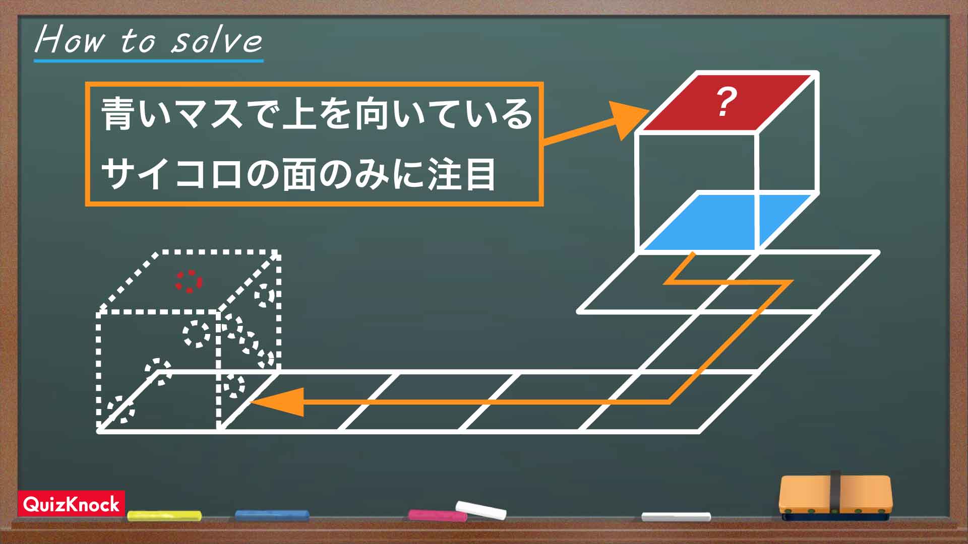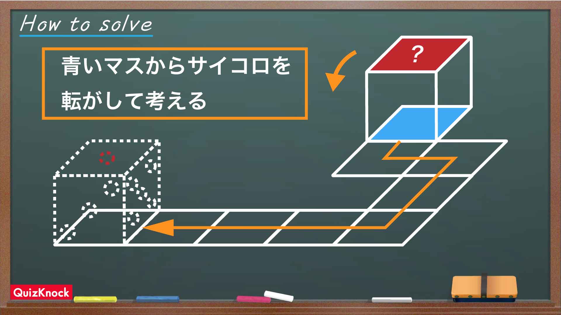 求めたいのは、サイコロが青色のマスに来たときに、上を向いている面の数字です。ここで、逆に「青いマスから開始し、サイコロをスタート地点まで転がす場合」を考えてみましょう。すると、青いマスで上を向いていた面が、スタート地点でどの方向に向くか」がわかれば、その方向の面の数字が答えになります。