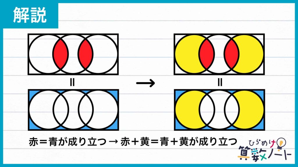 例えば、 A=B が成り立つとき A+C=B+C も成り立つように、「赤い部分の面積の和」と「青い部分の面積の和」の両方に同じ面積の和を足しても、面積が等しい関係が成り立ちます。