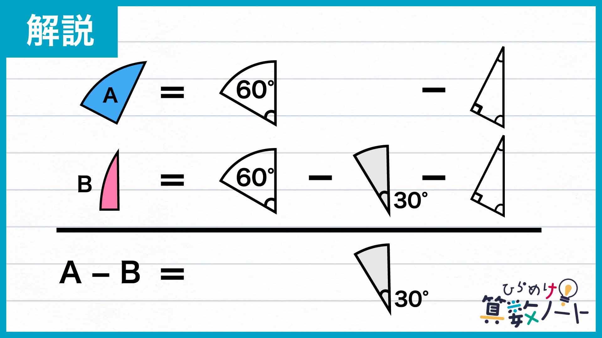 さらに、中心角30度の扇形は、同じ半径で中心角60度の扇形から中心角30度の扇形を引いた図形であるといえるので、Bの部分については下のように表すことができます。