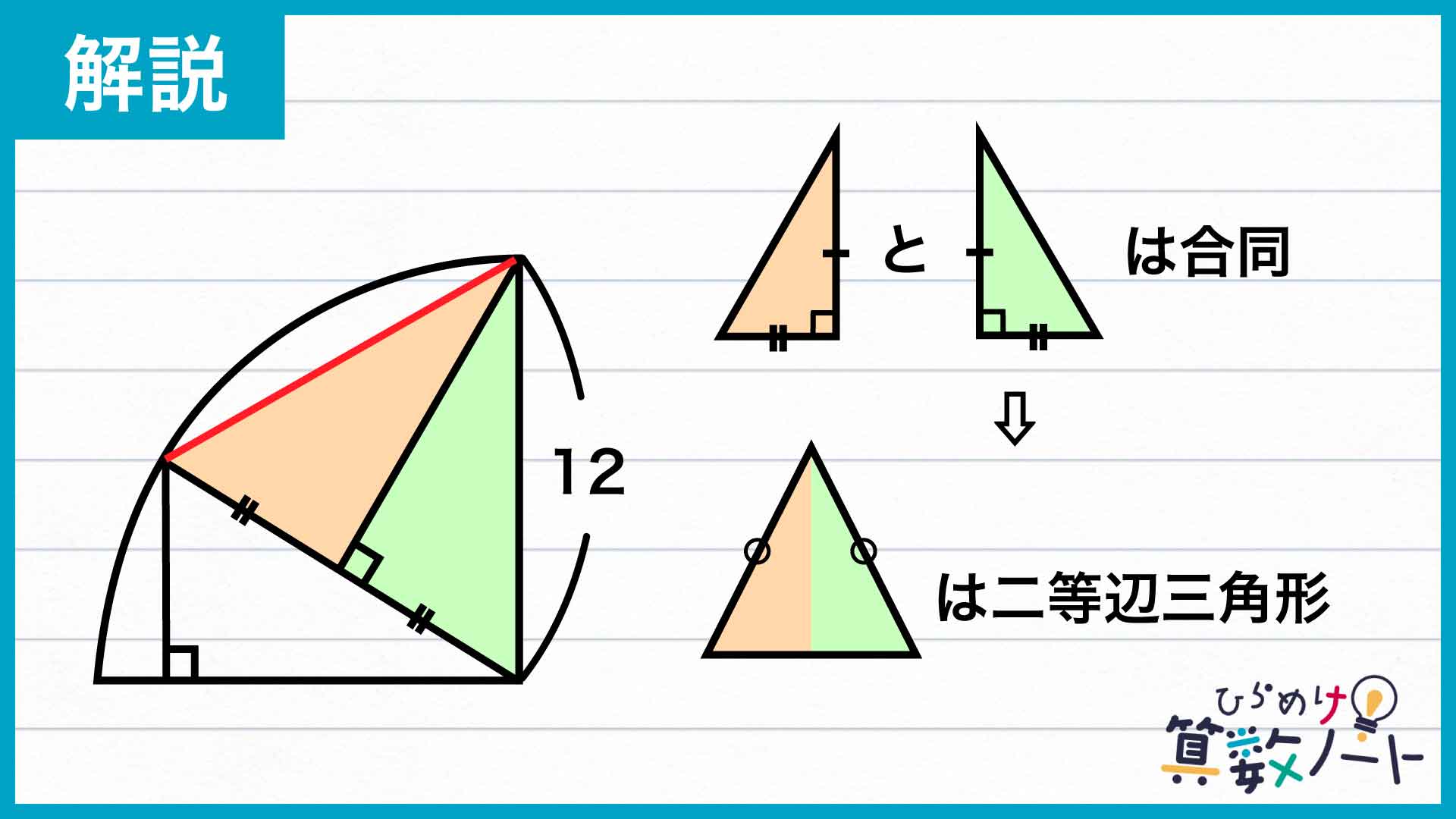 2つの三角形はどちらも直角三角形であり、直角を挟む2つの辺のうち一方は共通の辺、もう一方は扇形の半径を2等分したものであることがわかっています。したがって、1つの角とそれを挟む辺の長さが等しいことから、2つは合同な三角形であるといえます。