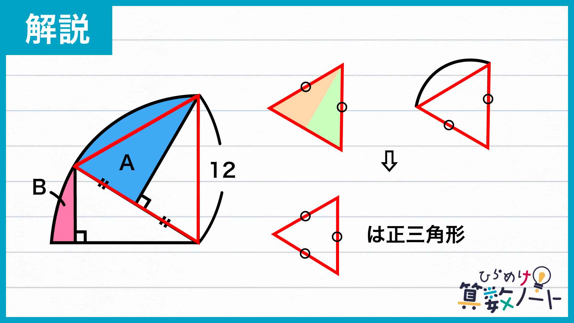 一方Bは、中心角30度の扇形から直角三角形を引いた部分にあたります。この直角三角形も内角の大きさがそれぞれ90度、60度、30度で斜辺の長さは扇形の半径にあたる12、すなわち先ほどの直角三角形と合同な図形といえます。