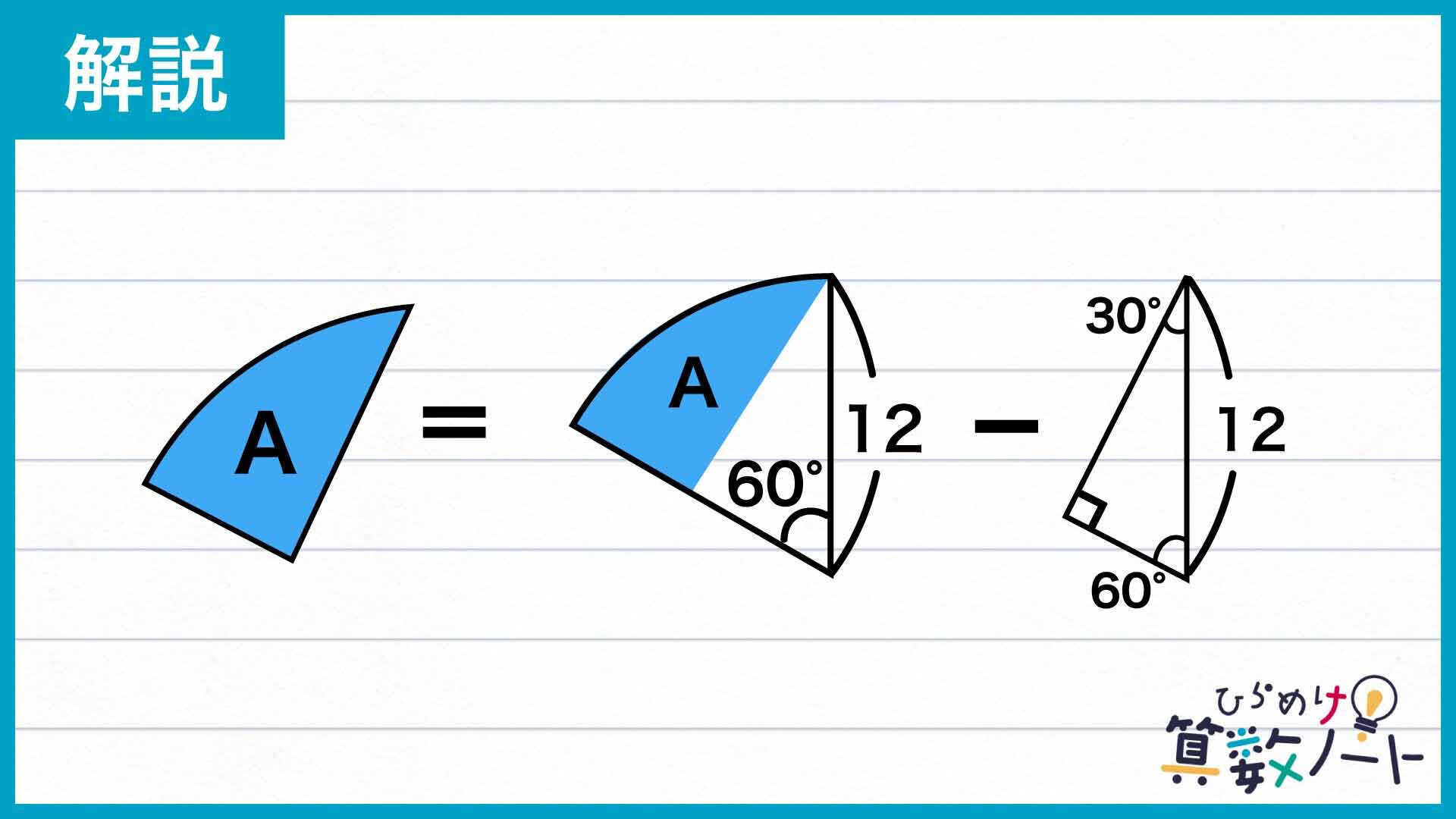まずAは、中心角60度の扇形から直角三角形を引いた部分にあたります。この直角三角形は正三角形をちょうど半分にした図形であり、内角の大きさがそれぞれ90度、60度、30度で、斜辺の長さは12です。