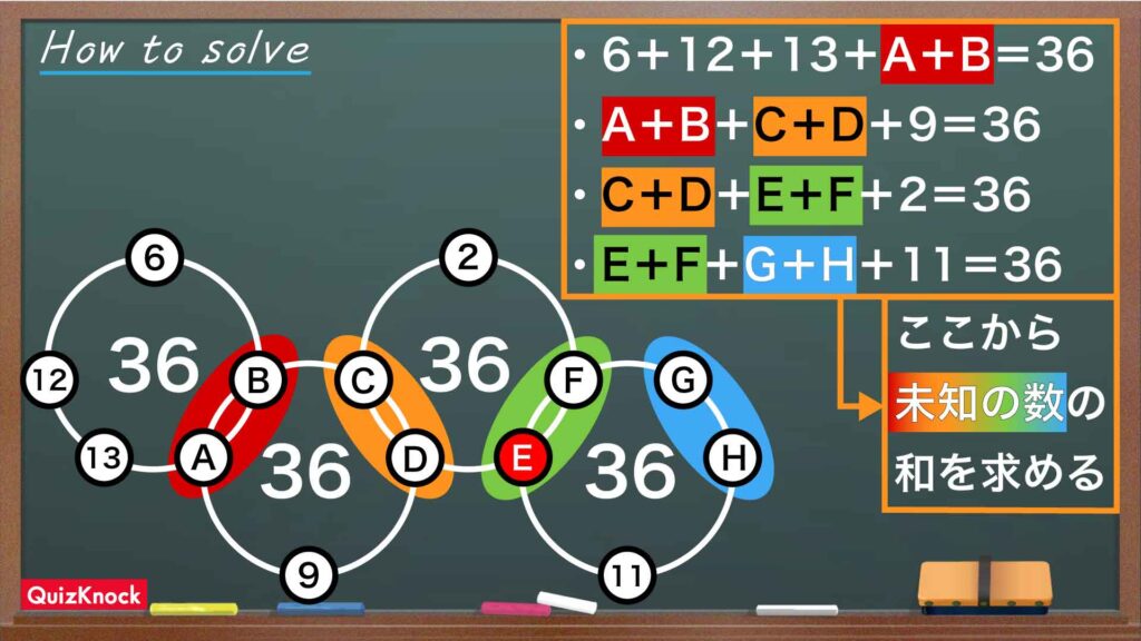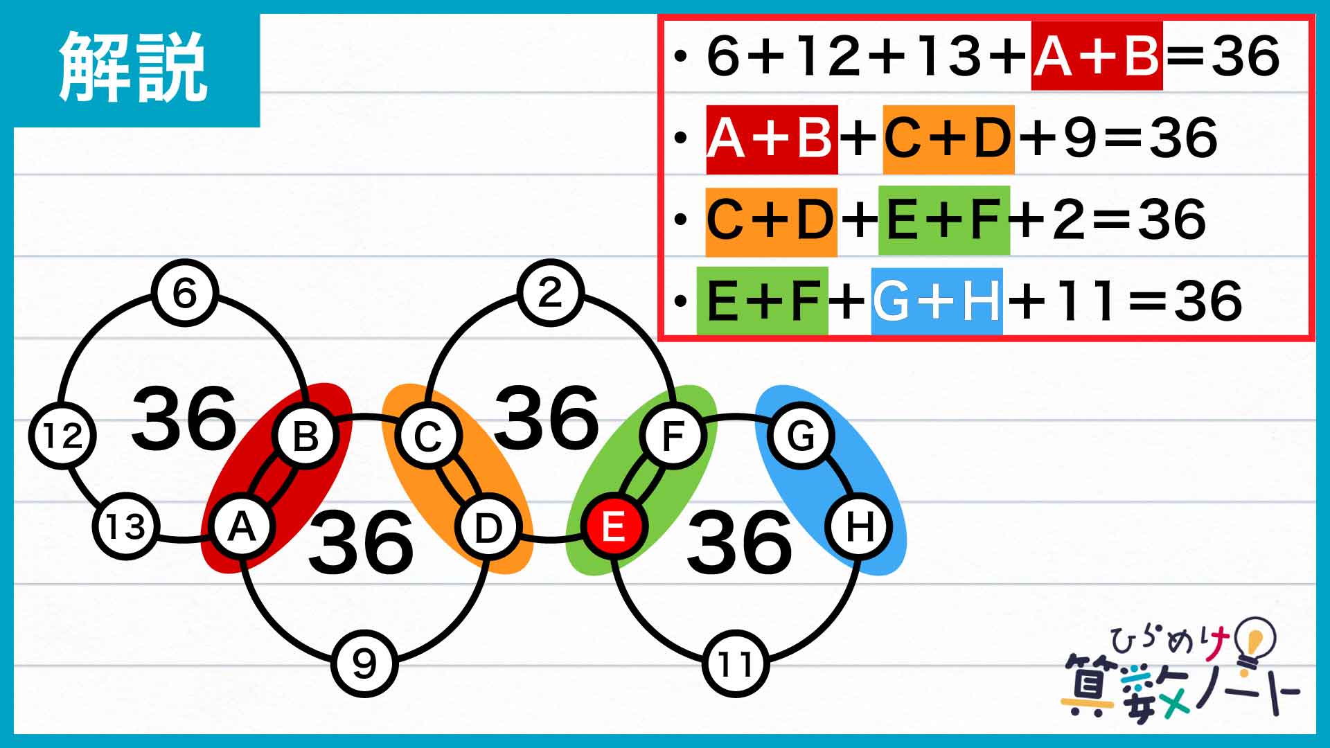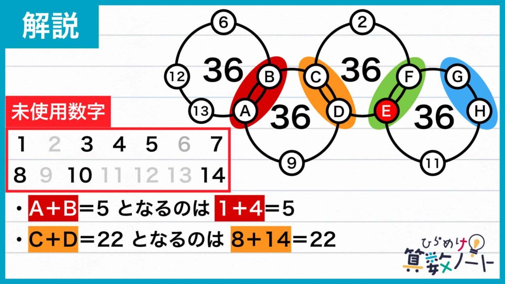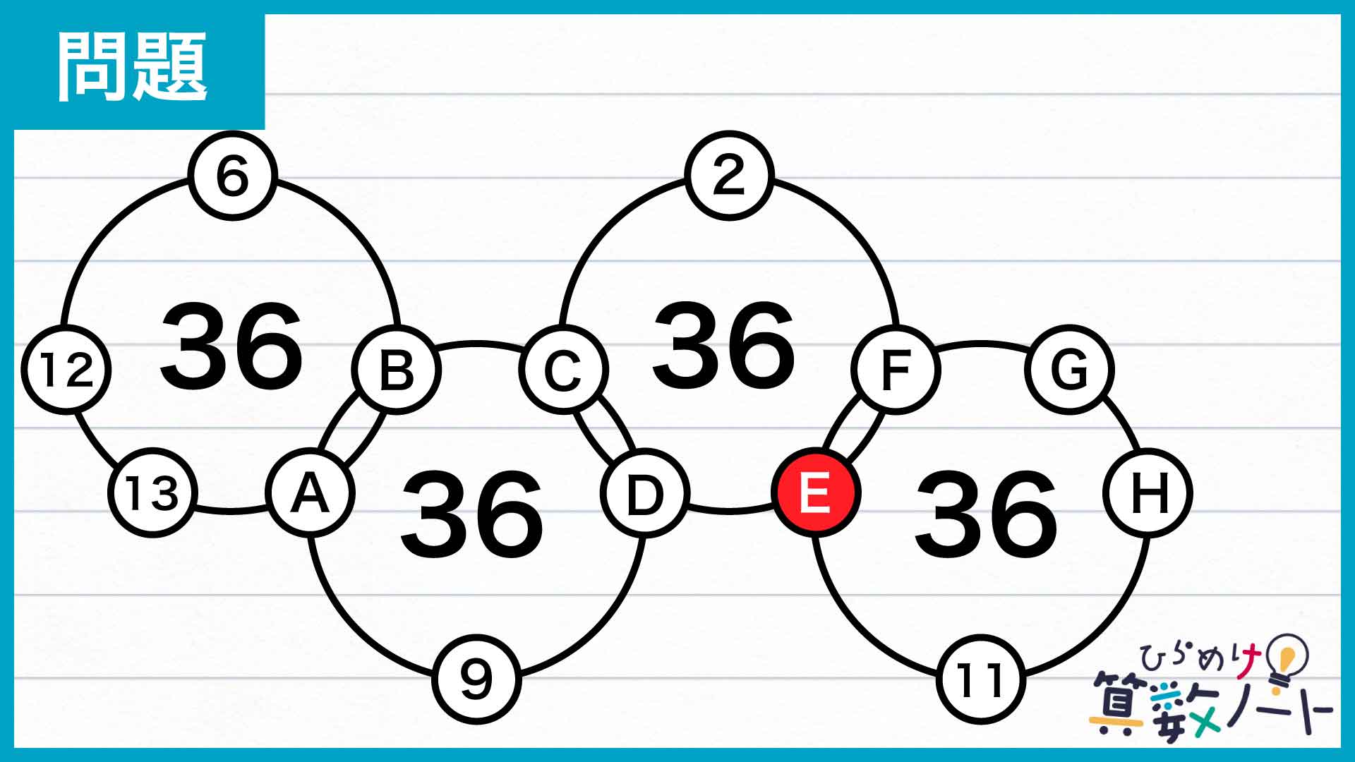 それでは解説です。この問題のポイントは、各円の数字の合計が36になることを使って、未知の数の組み合わせを絞り込むことです。