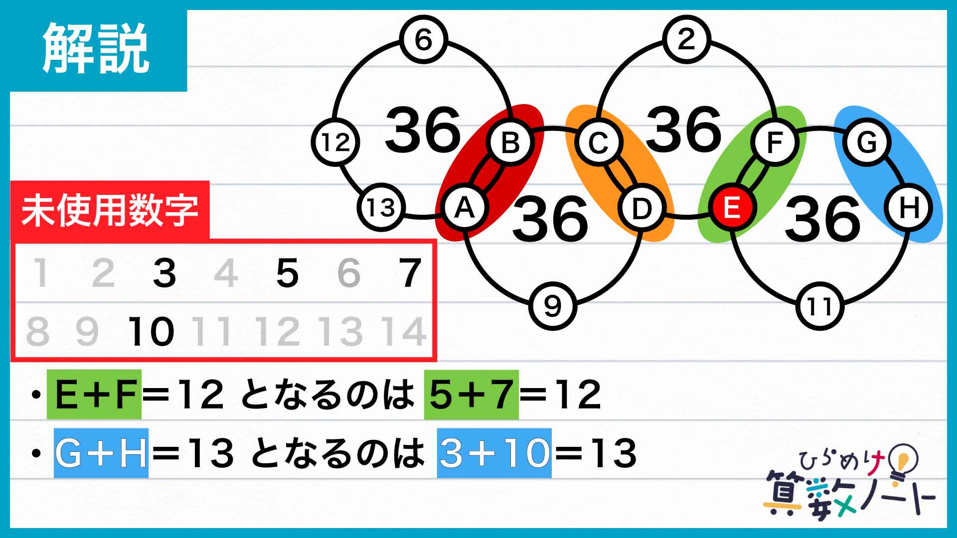 残りの数字(3、5、7、10)から、E + F = 12とG + H = 13を作る組み合わせを探します。
