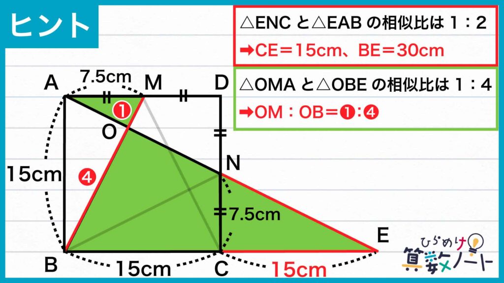 よって、線分CEの長さは15cmであり、線分BEの長さは15+15=30cmとなります。MA=7.5cm、BE=30cmなので、三角形OMAと三角形OBEは相似比が1:4であり、線分OMと線分OBの長さの比は1:4です。