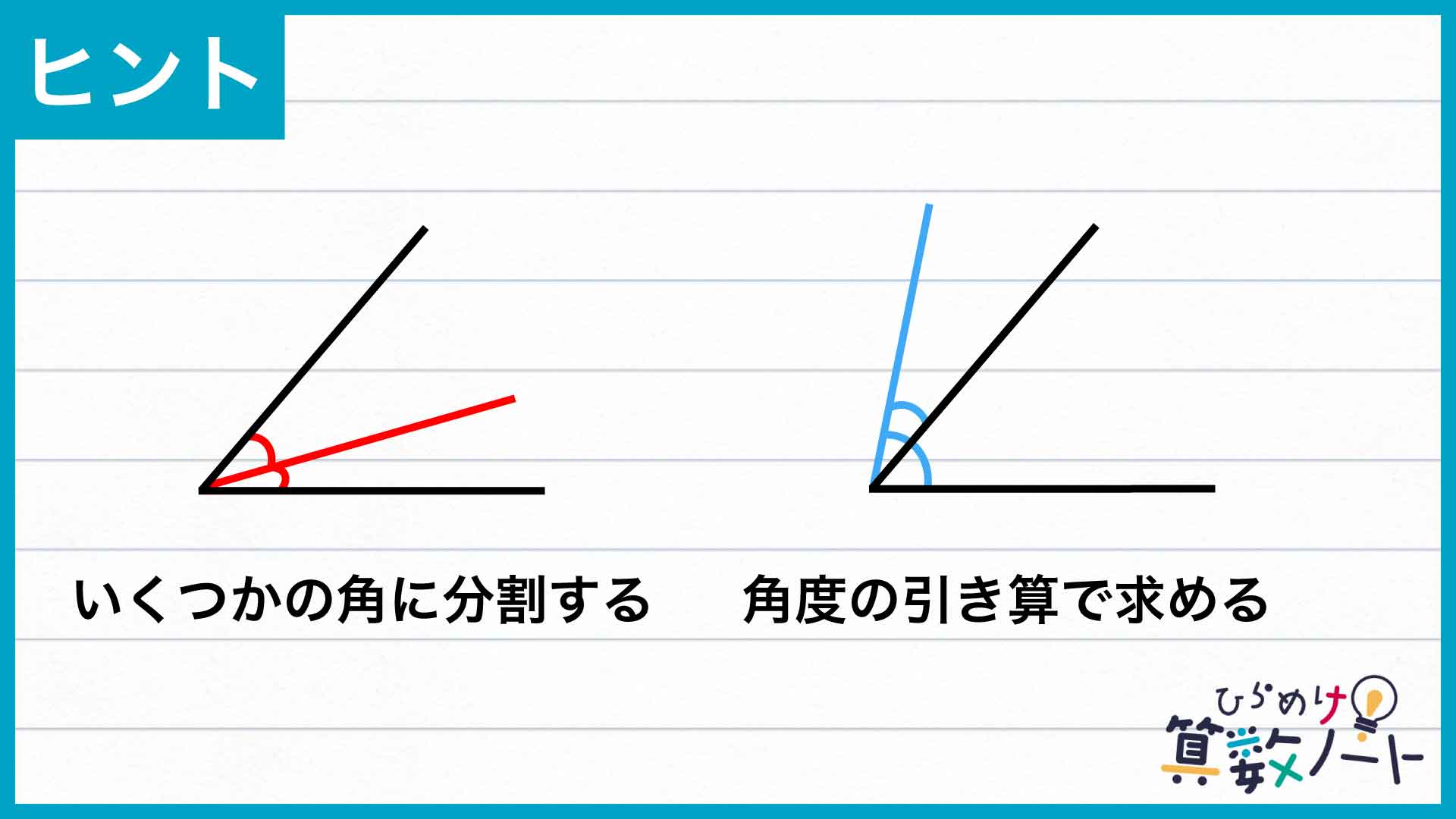 角度の大きさを直接求めることが難しいときには、下の図のように「いくつかの角に分割する方法」か「角度の引き算で求める方法」が有効な場合が多いです。