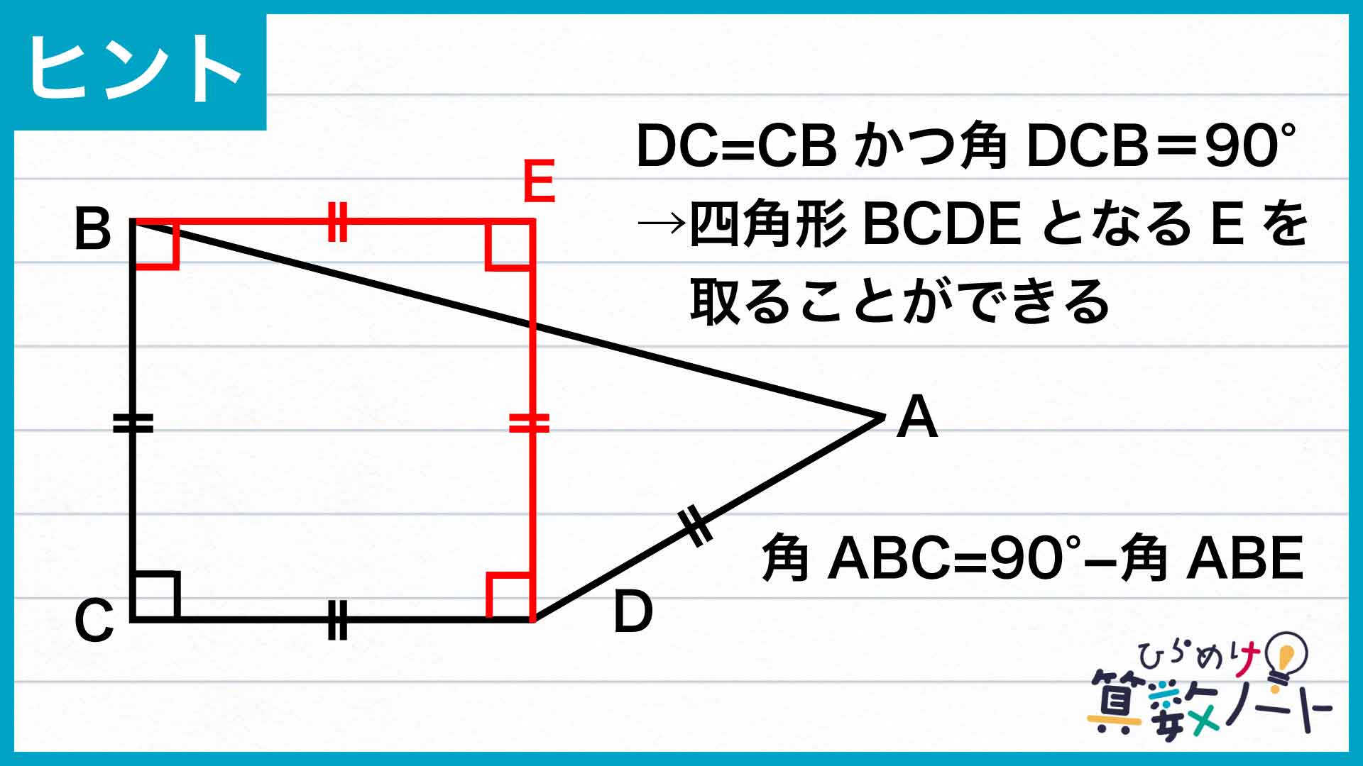 問題文の条件より、DC=CBかつ角DCB=90度ですから、四角形BCDEが正方形になるように点Eを取ることができますね。このように点Eを取ると角EBC=90度となるので、角ABC=角EBC-角ABE=90-角ABE、と求めることができます。