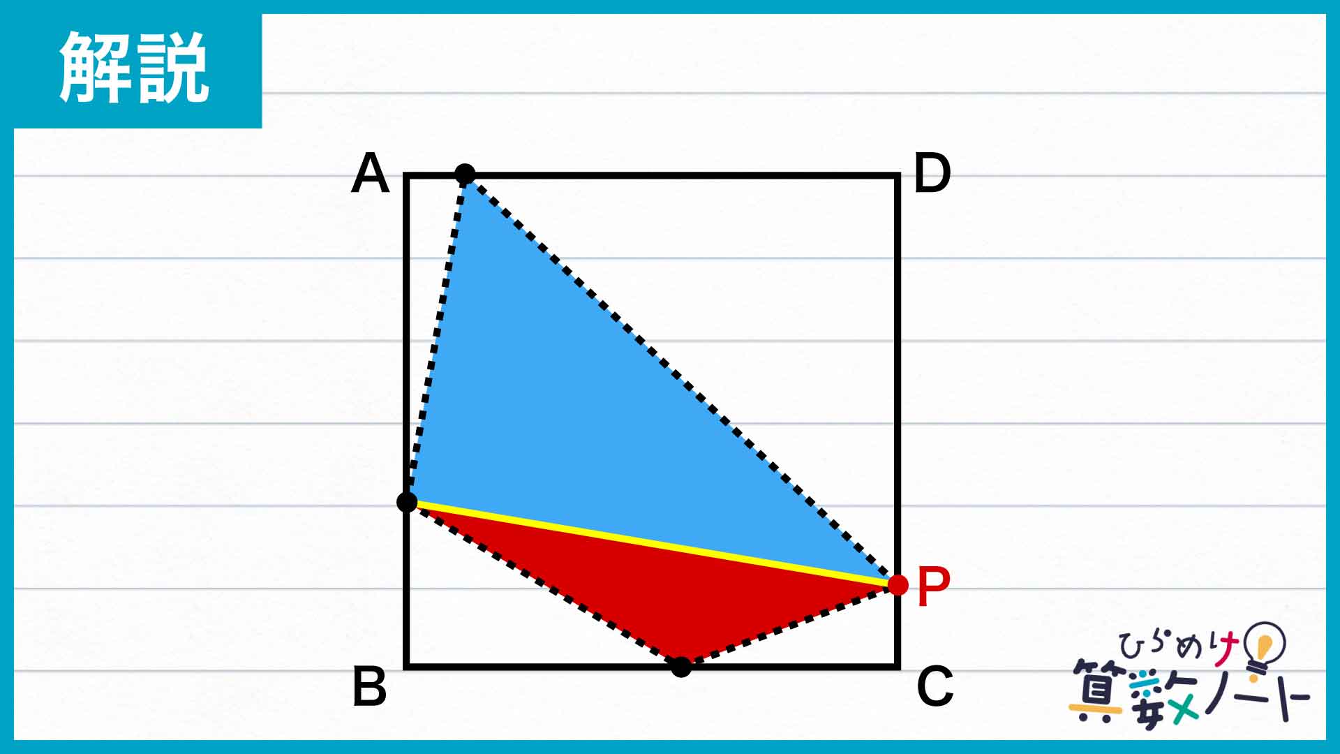 ここで大切なのが、正方形ABCDと、点Pを含む4点で囲まれた四角形を、それぞれ2分割することです。点Pを含む四角形はこのままだと歪んでいて面積を考えづらいので、下の図のように2つの三角形に分けてみましょう。