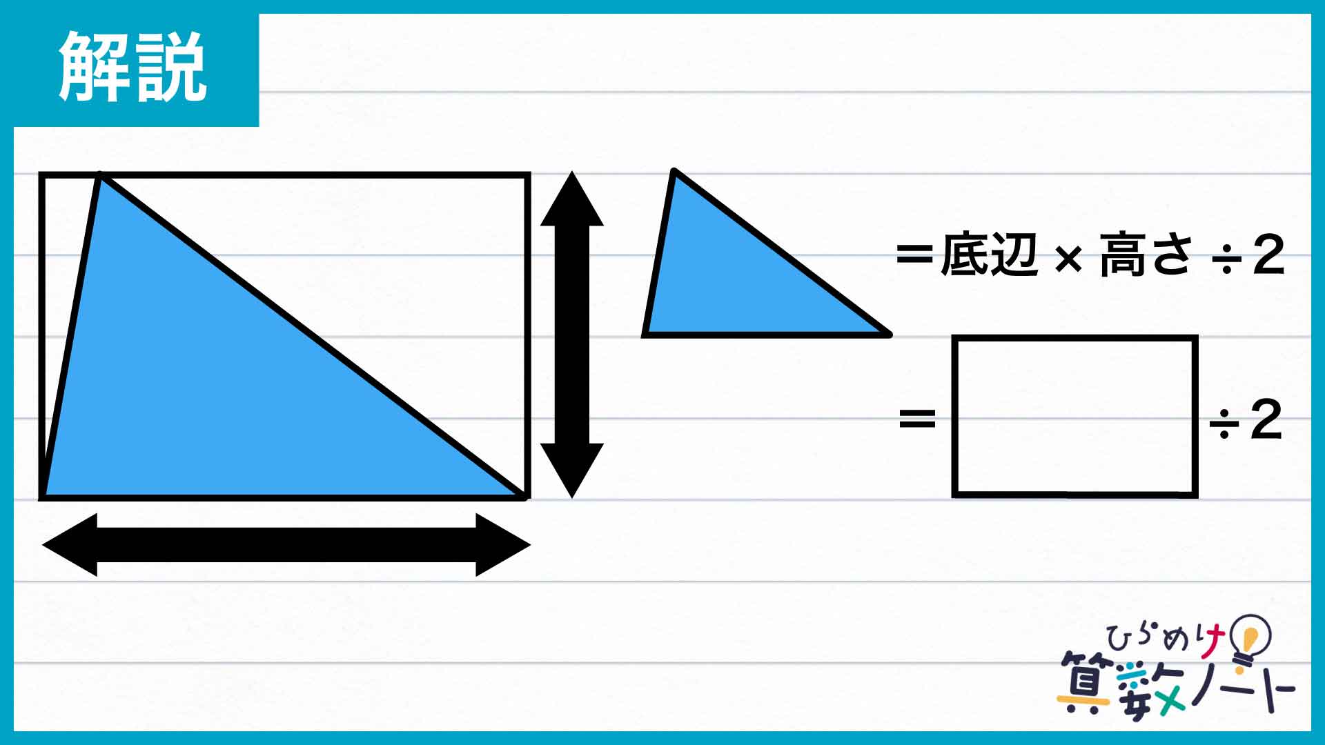 三角形の面積は、「底辺×高さ÷2」で求めることができます。つまり、下の図のように三角形と長方形の底辺・高さが等しくなる場合を考えれば、三角形の面積は長方形の面積のちょうど半分となります。