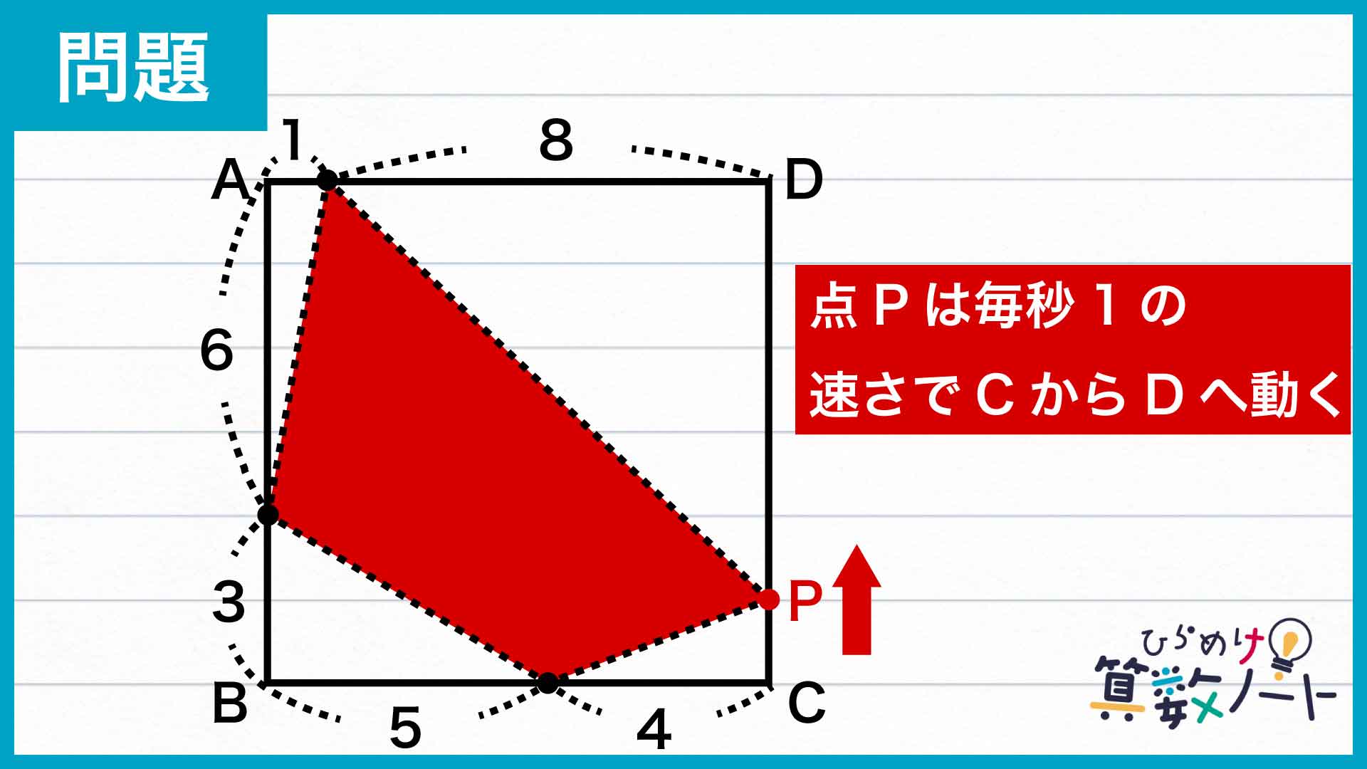 ちなみに、出発から3秒後以外に答えになりうるタイミングはないのでしょうか? 実は、赤い四角形を除く「余白」の部分の変化について考えれば、点Pが動くにつれ赤い四角形は大きくなる一方、すなわち条件を満たすタイミングは一度しかないことがわかります。余裕のある方はぜひ、このことについても考えてみてくださいね。