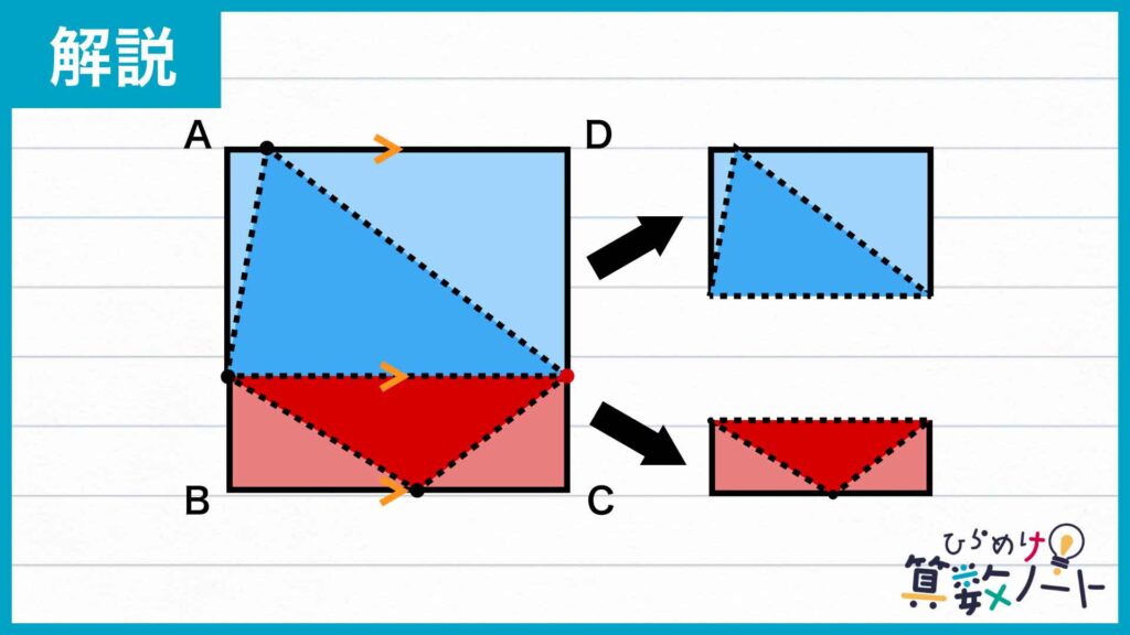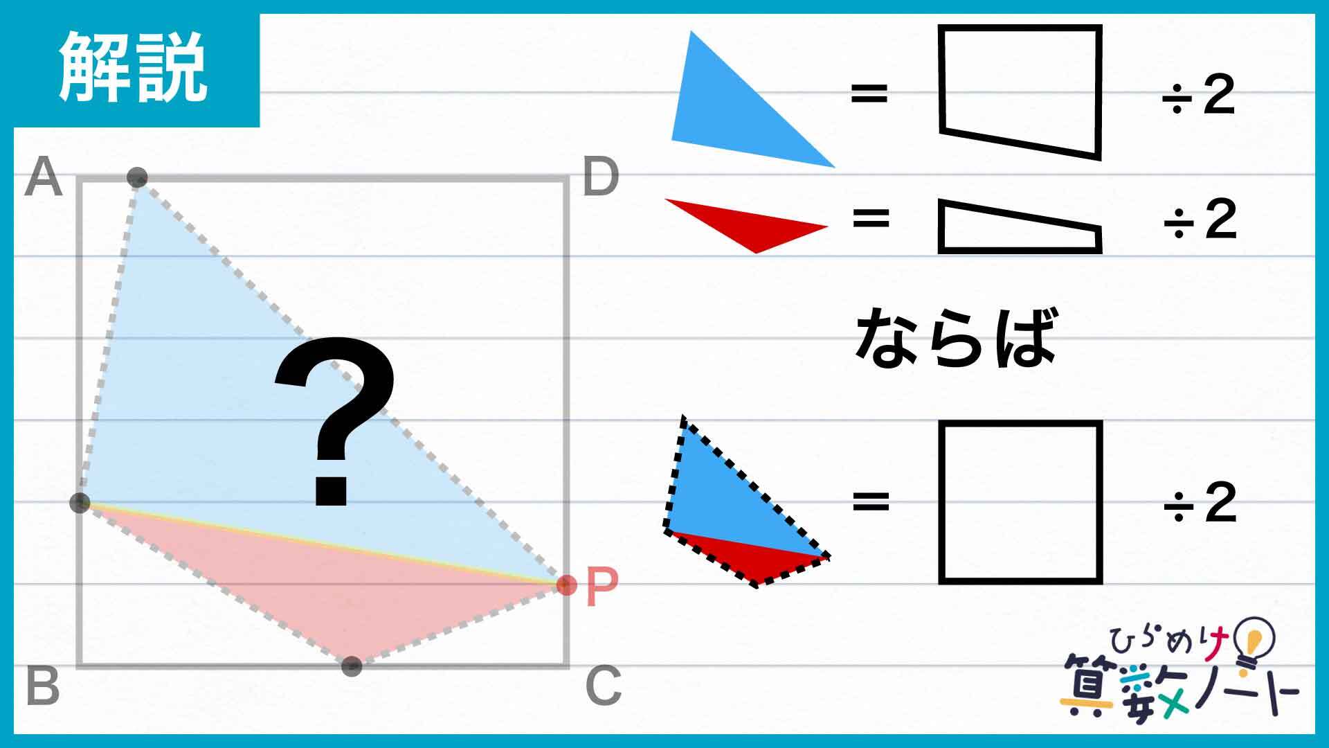 すると、点Pを頂点のひとつとする四角形が分割されてできた三角形2つは、底辺と高さが長方形の辺の長さと一致しており、それぞれの面積は長方形のちょうど半分にあたることがわかります。したがってこのとき、点Pを頂点のひとつとする四角形全体の面積も正方形ABCDの半分になります。