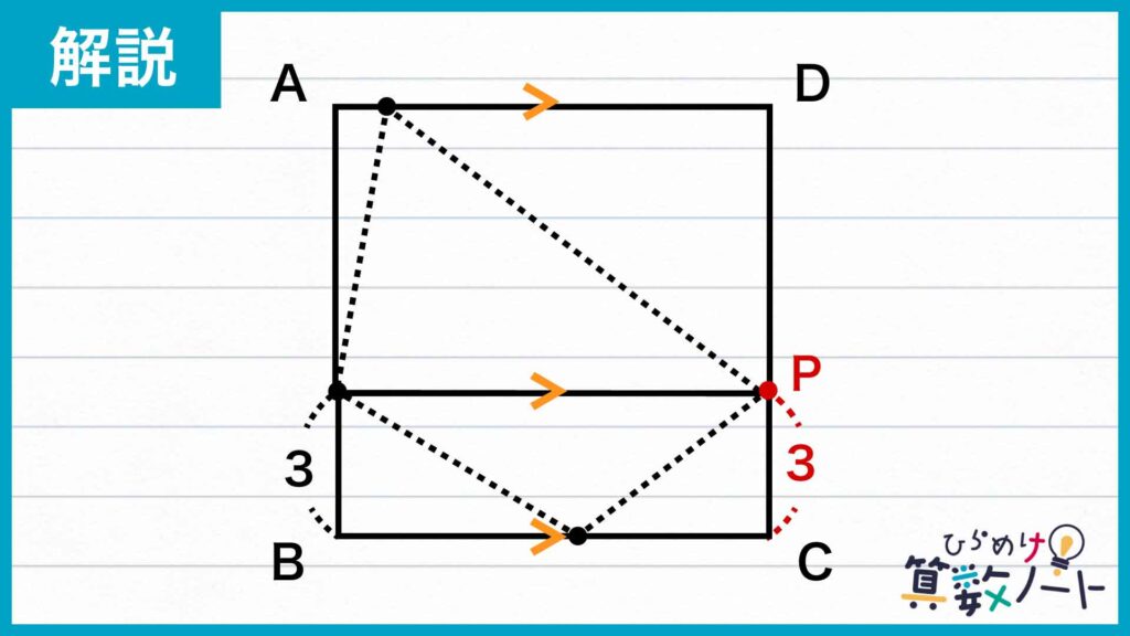 よって、点Pと向かいの点を結んだ線分が正方形の2辺と平行になるとき、つまり点Pが頂点Cを出発して3だけ進んだときが求める瞬間だとわかるのです。