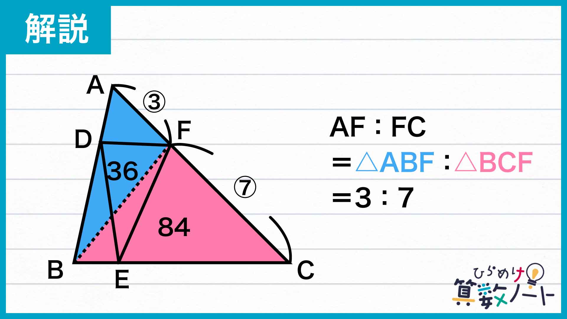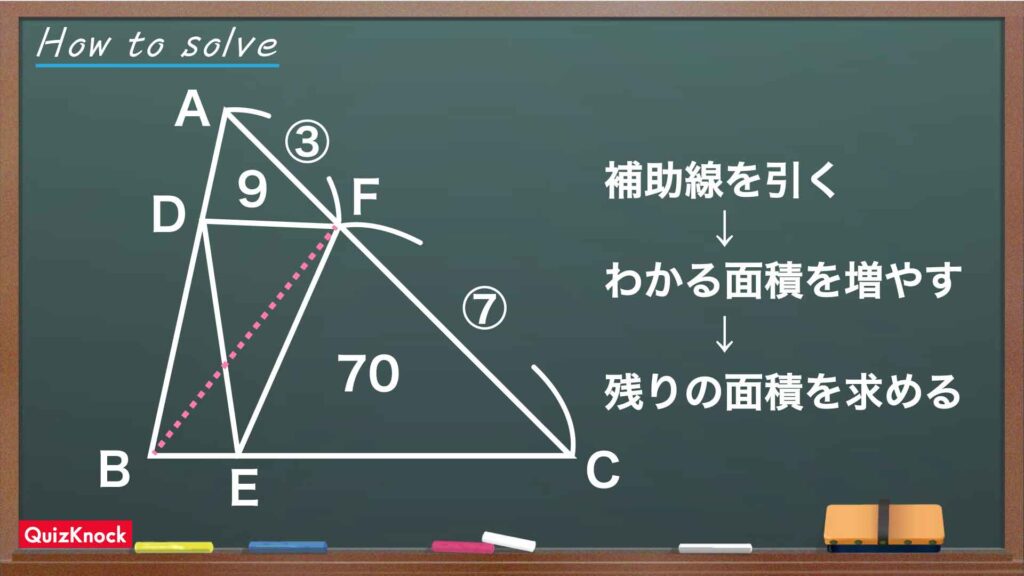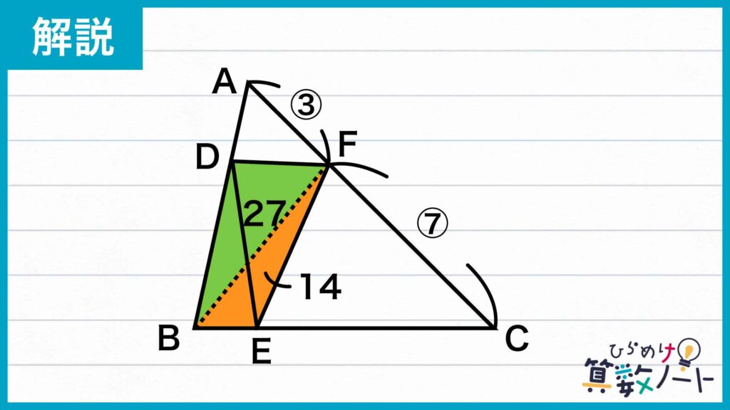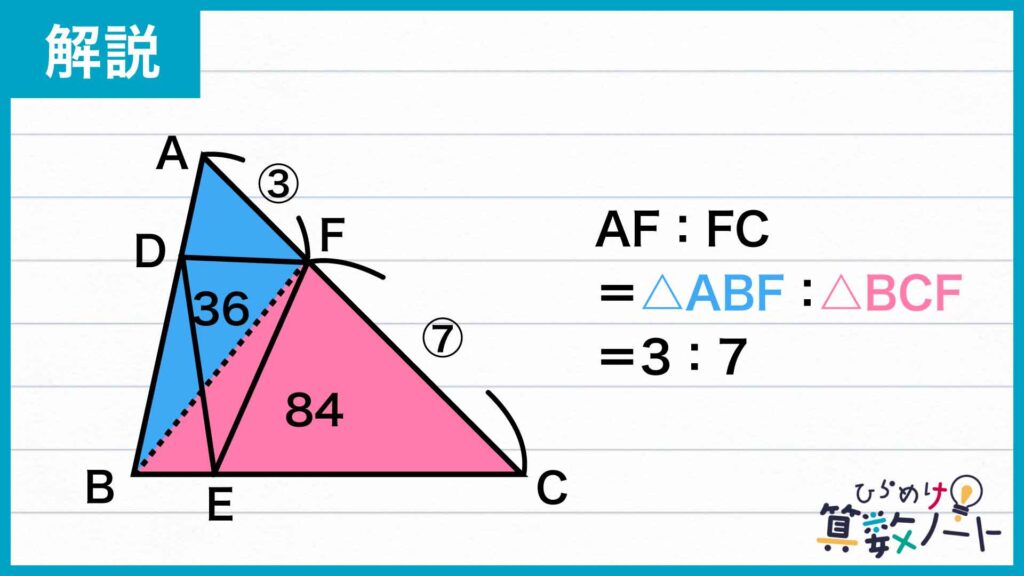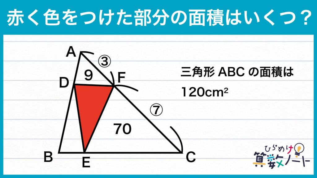 同様に、三角形BCFの中では三角形CEFが70cm2なので、三角形BEFの面積は84−70=14cm2となります。
