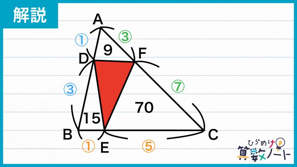 点DとEの位置がわかったので、三角形BDEの面積を求めます。これまでと同様に、同じ高さをもつ三角形では、底辺の比がそのまま面積の比になることを利用しましょう。