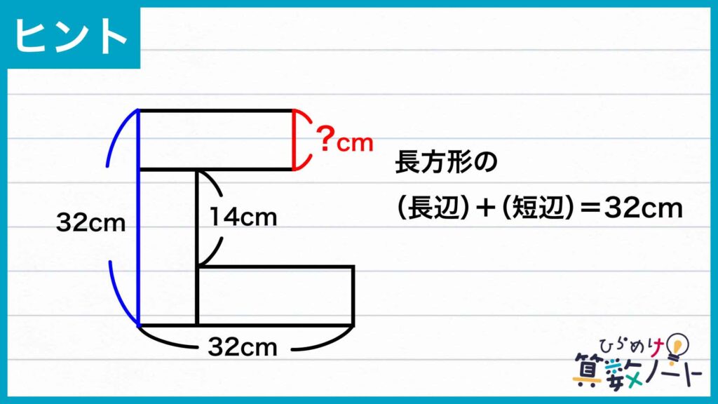 ヒント 3つの長方形はすべて同じ形です。 また、長方形の長辺と短辺を合わせた長さが32cmであることがわかっています。 よって、以下の図の青色で示した長さも32cmであることがわかります。 今わかっている値で図形の長さを表してみましょう! 3ページ目:【答え&解説】ここまで来ればあと少し! 答えと解説はこちらへ