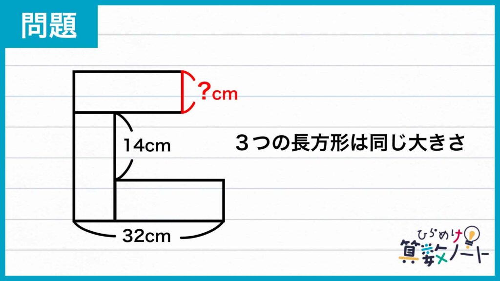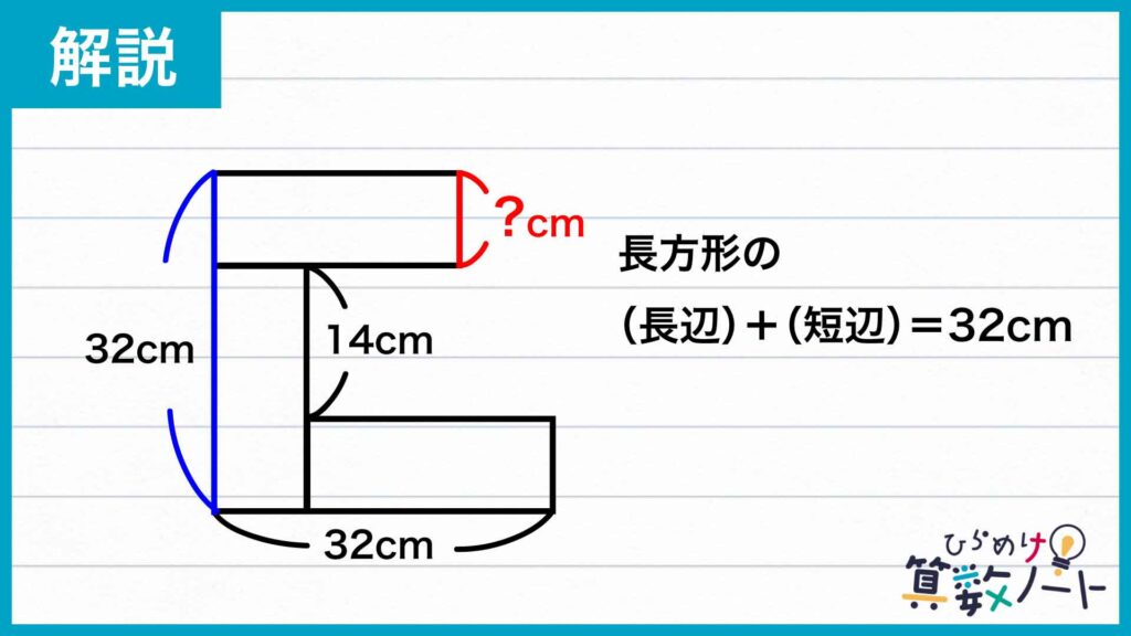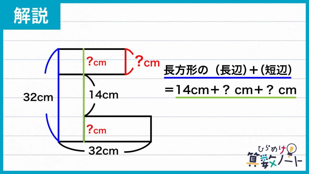 これらのことから、長方形の長辺と短辺を合わせた長さは、長方形の短辺2つ分と14cmを合わせた長さと等しくなることがわかります。
