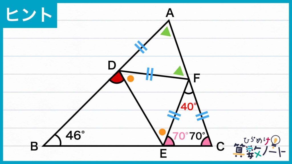 同様に考えると、三角形ADFにおいて角DFA=角FAD、三角形FDEにおいて角FDE=角DEFであることがわかります。