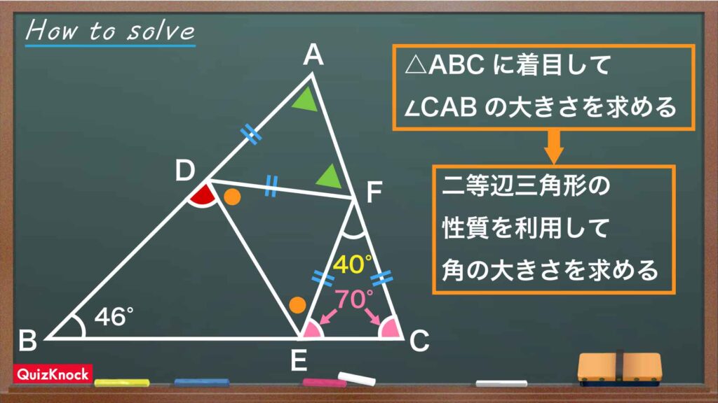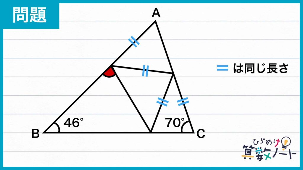 ポイントは、図形全体に着目し、二等辺三角形の性質を利用することです。これを踏まえて解いていきましょう!