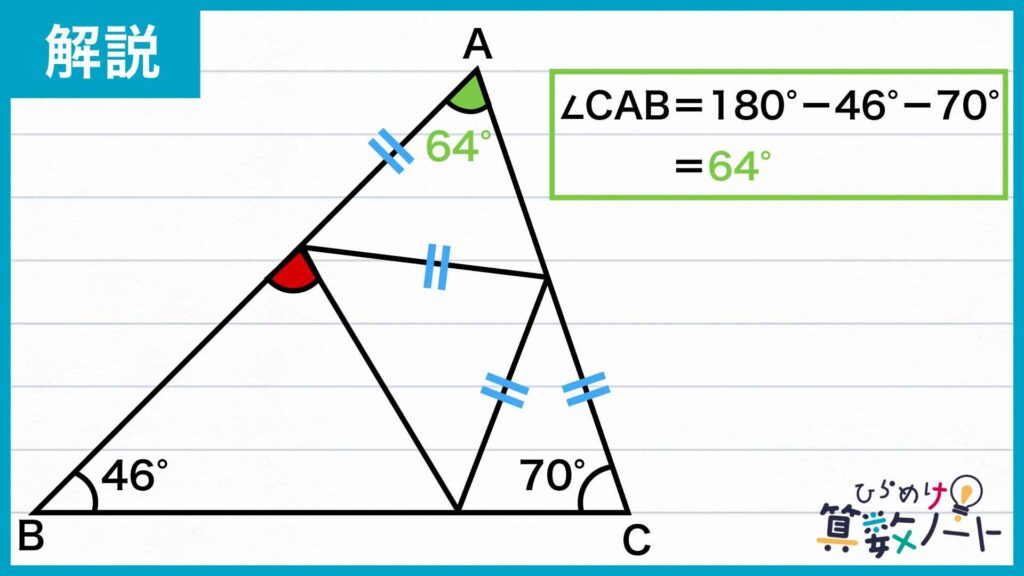三角形ABCにおいて、角ABC=46度、角BCA=70度なので、角CAB=180-46-70=64度であることがわかります。