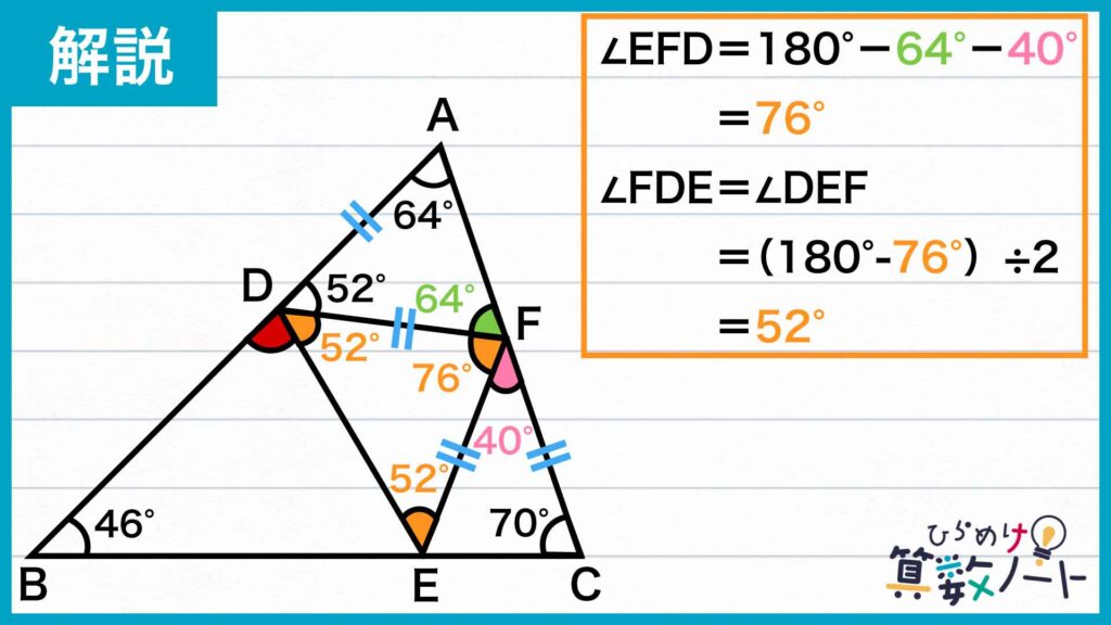なお、三角形FDEも二等辺三角形なので、角FDE=角DEF=(180-76)÷2=52度となります。