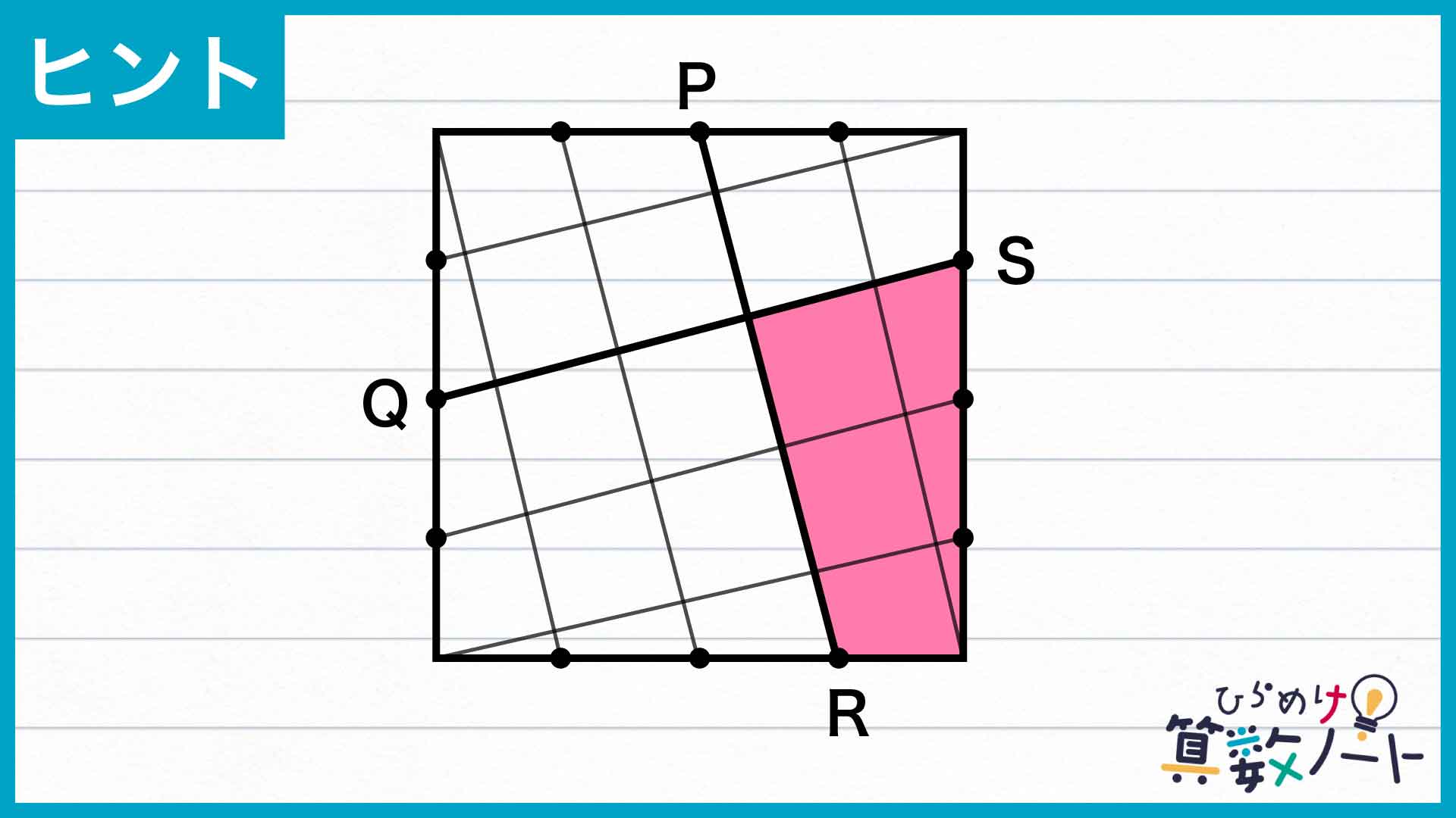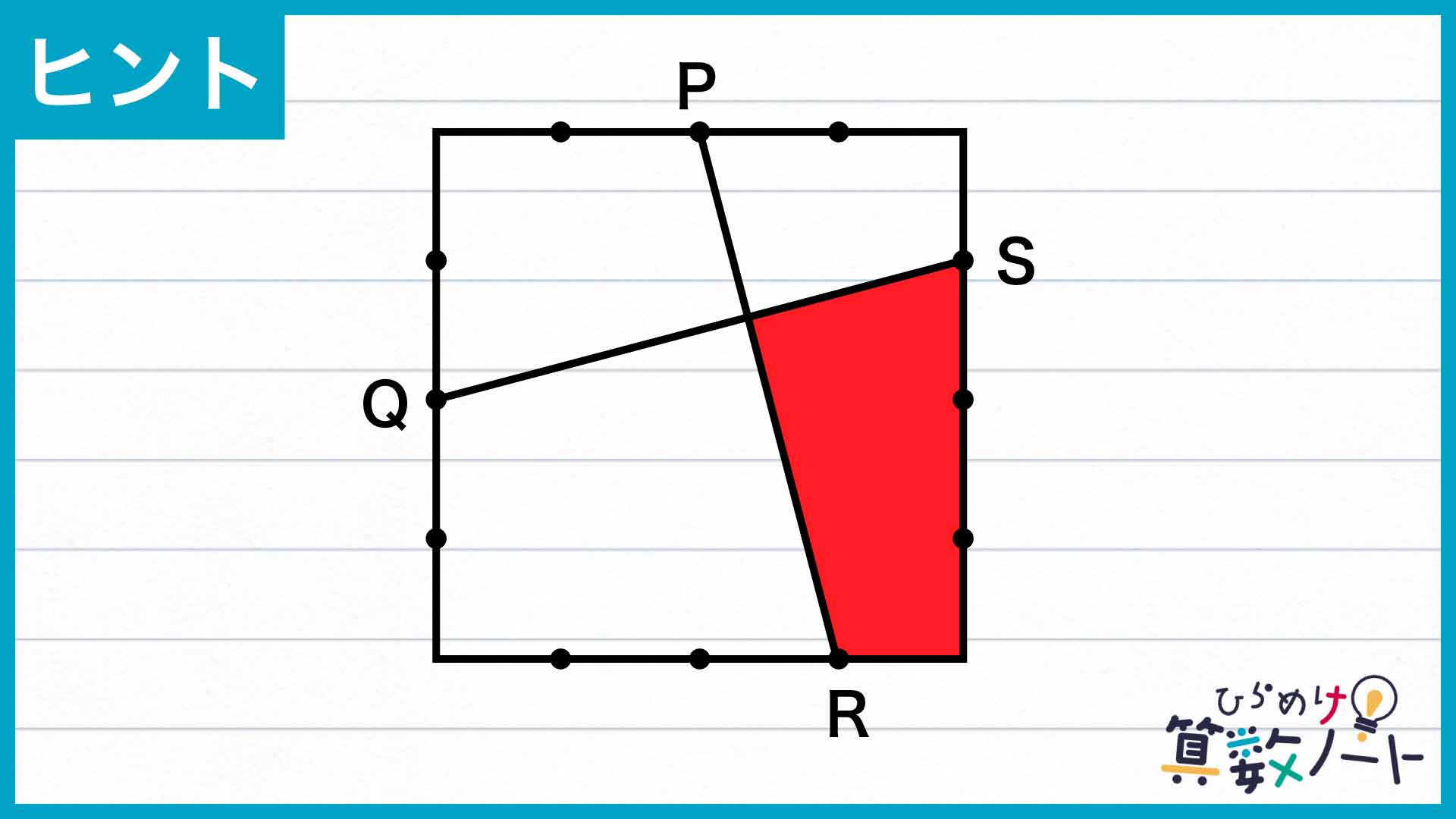 今回は、より視覚的に理解しやすい考え方をしてみましょう。4つの点は正方形の各辺を1:1または3:1に分けているので、下の図のようにP、Q、R、Sを含む点で正方形の各辺を4等分してみます。