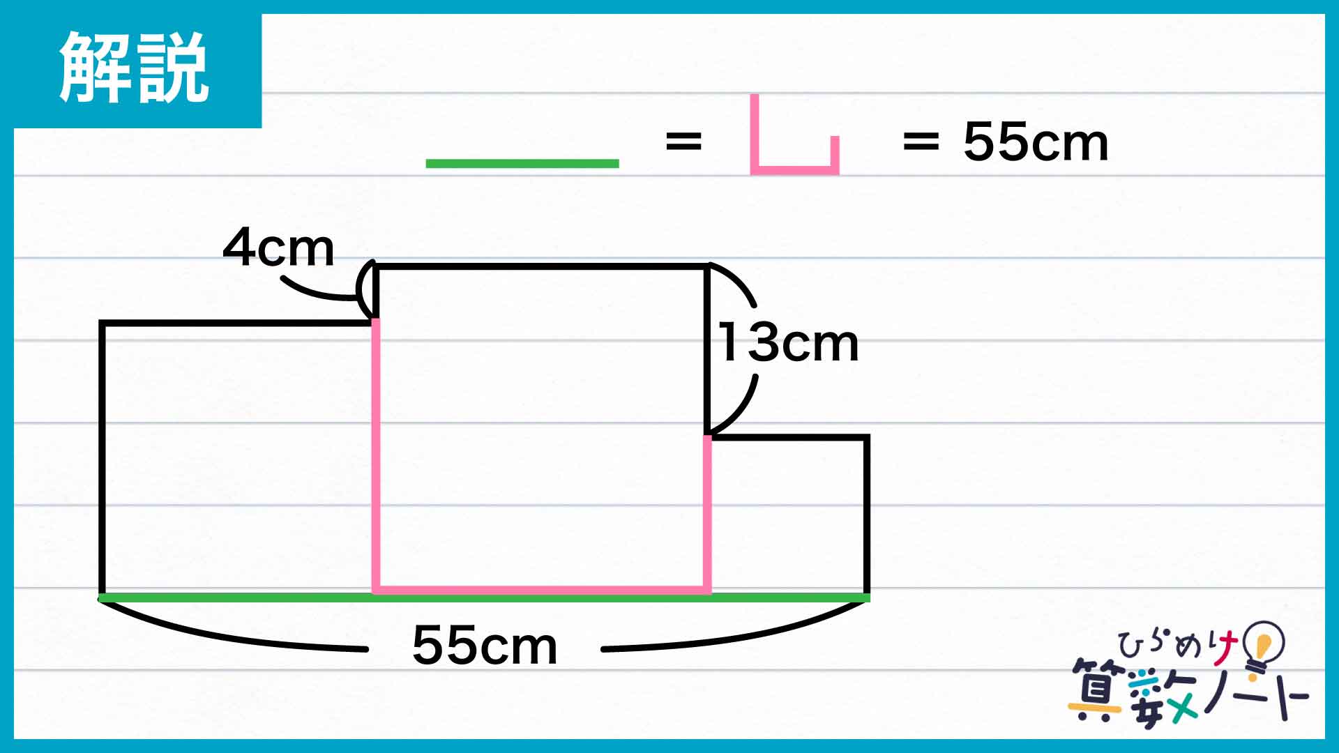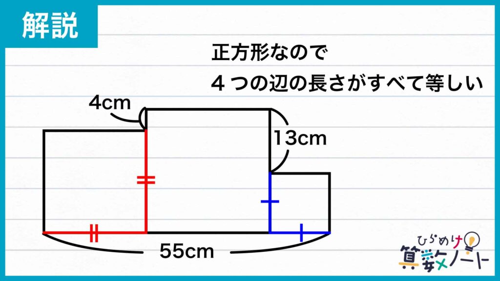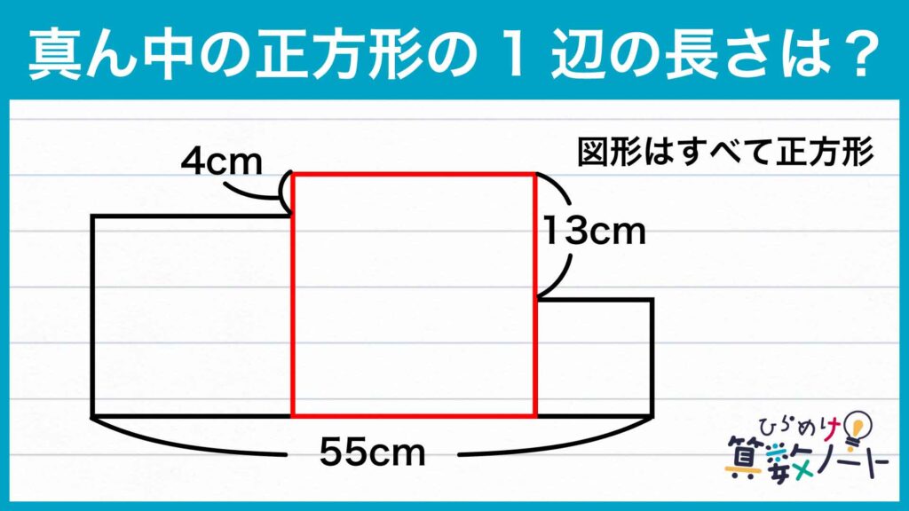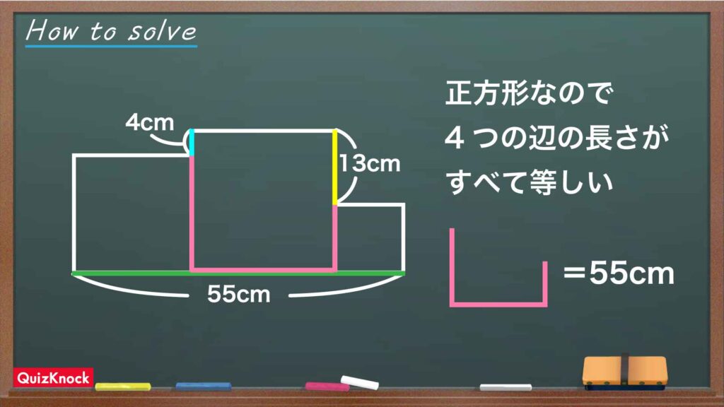 さらに、下の図の色をつけた線分はどちらも、3つの正方形それぞれの1辺の長さの和であるため、55cmであることがわかります。