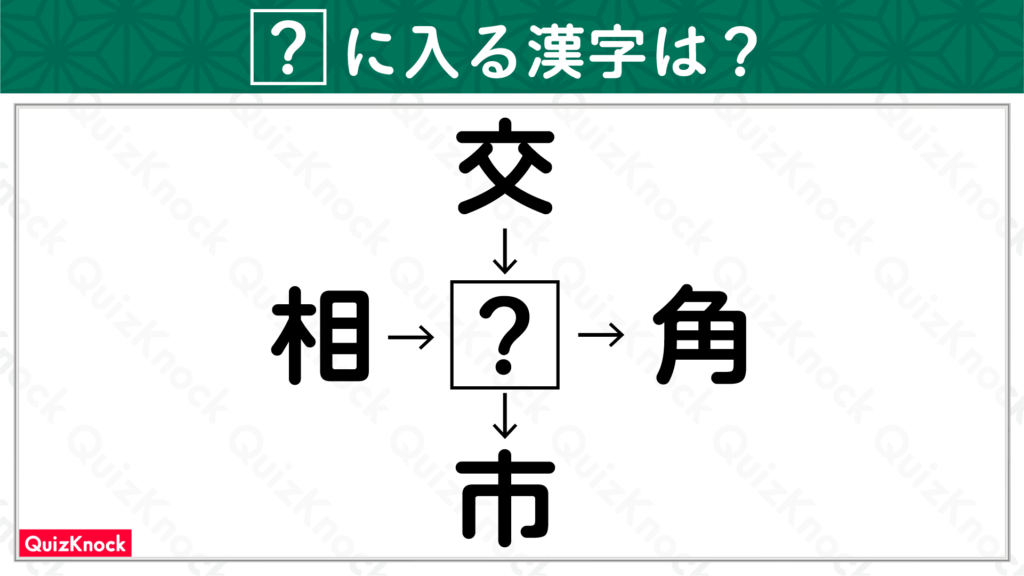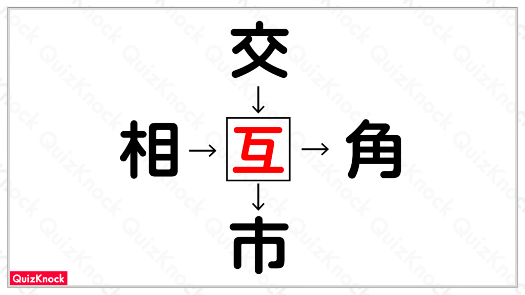 答えは「互」です。「相互」「交互」「互角」「互市」の4つの熟語ができます。