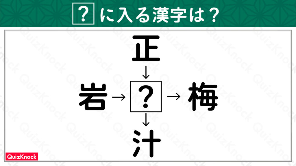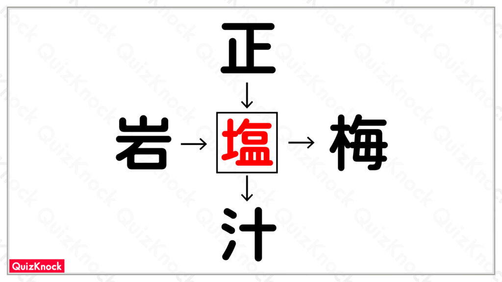 答えは「塩」です。「岩塩」「正塩」「塩梅」「塩汁」の4つの熟語ができます。