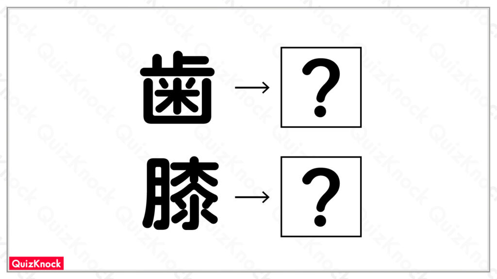 設問画像のほか、「歯〇」や「膝〇」といった熟語に使われる字です。