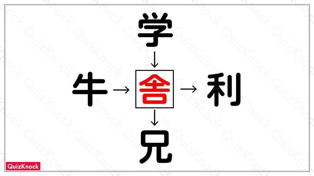 答えは「舎」です。「学舎」「牛舎」「舎兄」「舎利」の4つの熟語ができます。