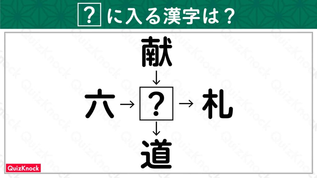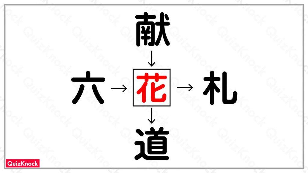 答えは「花」です。「献花」「六花」「花道」「花札」の4つの熟語ができます。