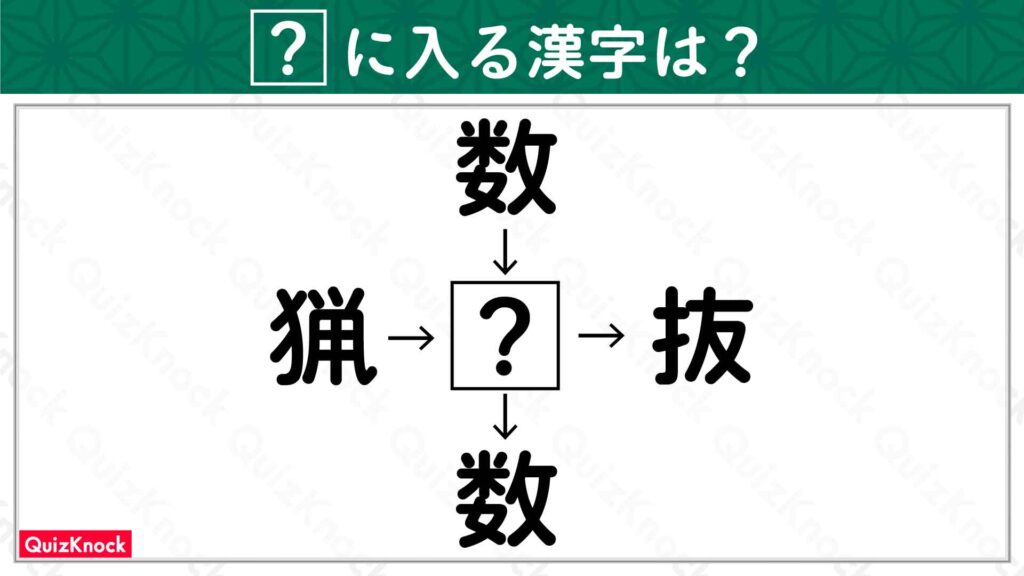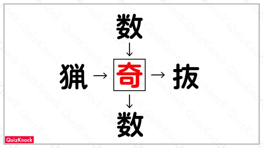 答えは「奇」です。「数奇」「奇抜」「奇数」「猟奇」の4つの熟語ができます。