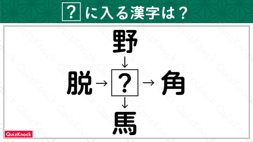 答えは「兎」です。「野兎」「脱兎」「兎角」「兎馬」の4つの熟語ができます。